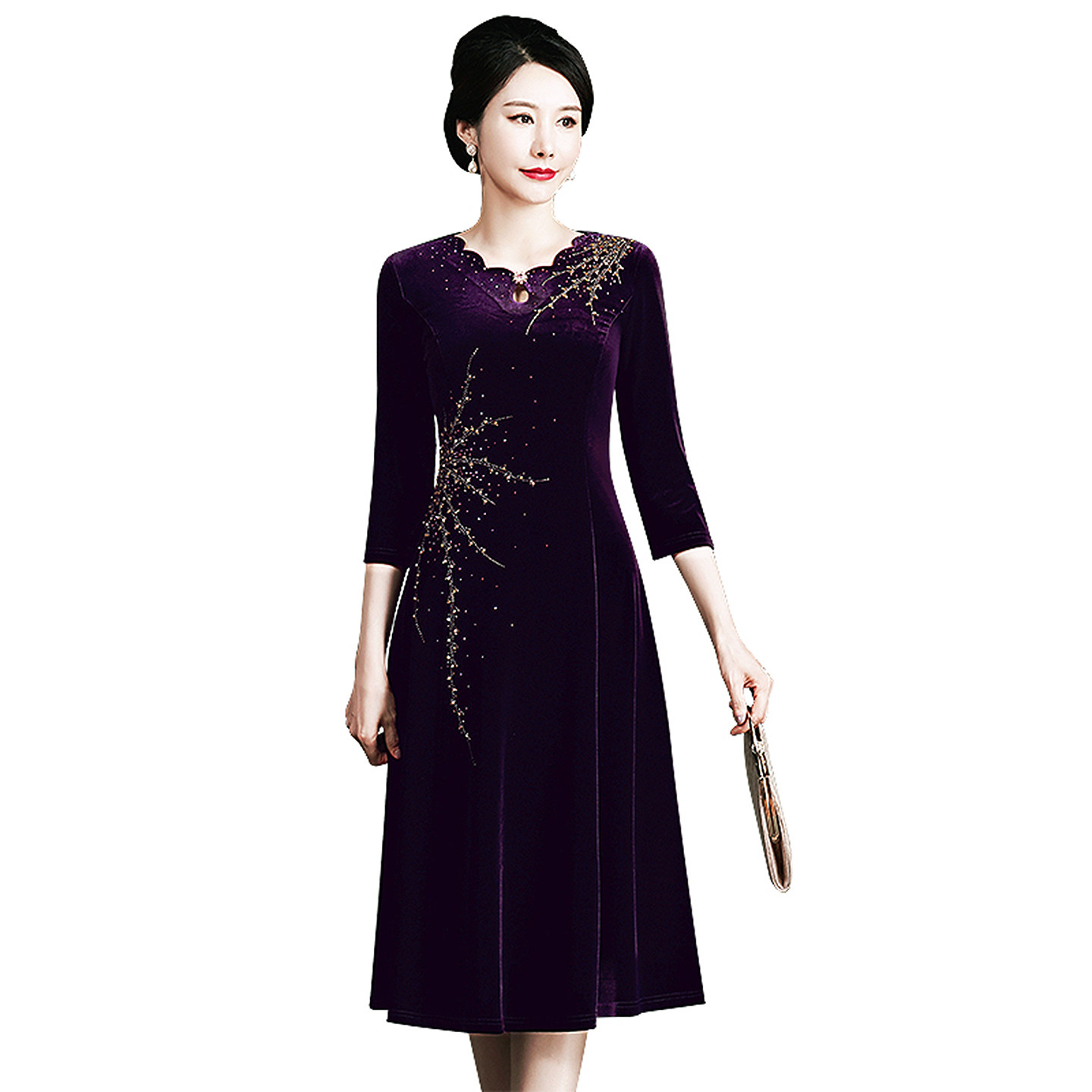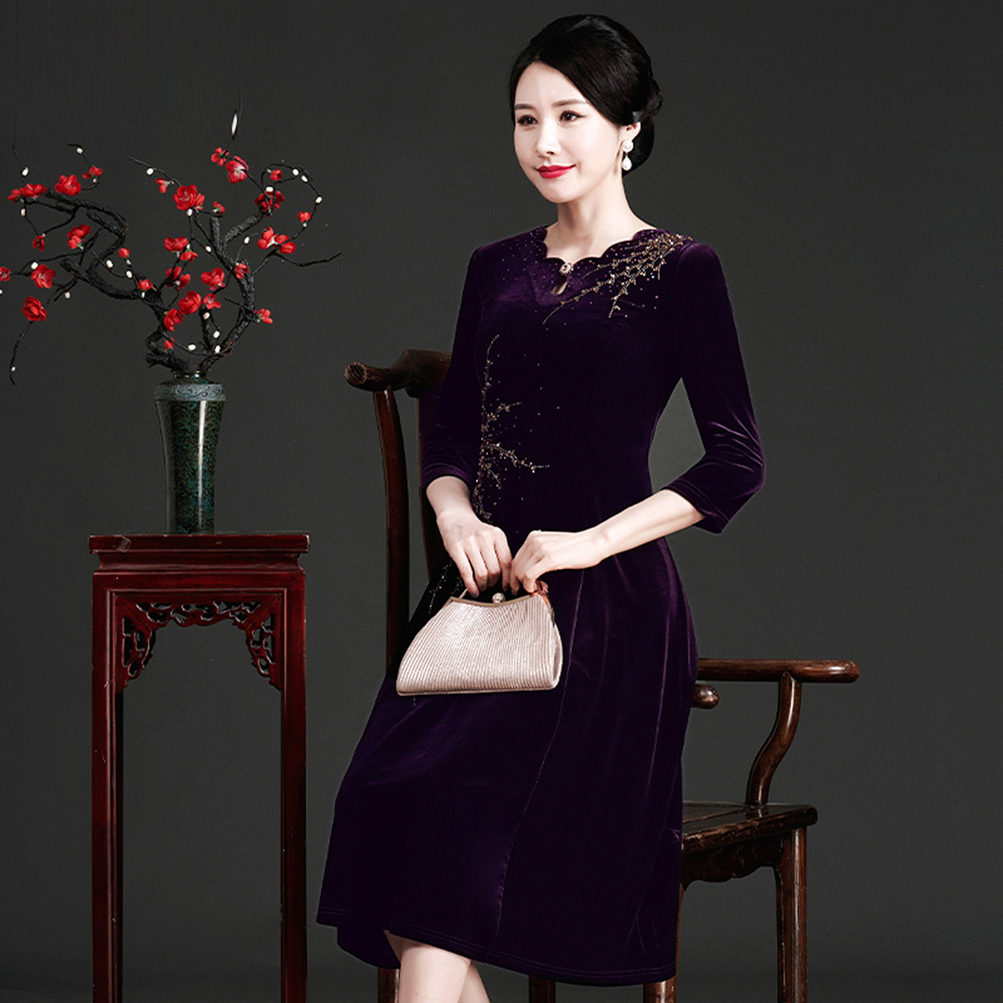 高端婚礼妈妈装连衣裙中长款大码显瘦时尚中年女装春秋季金丝绒裙