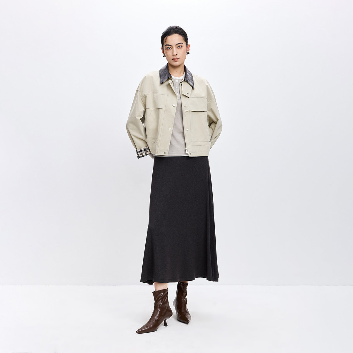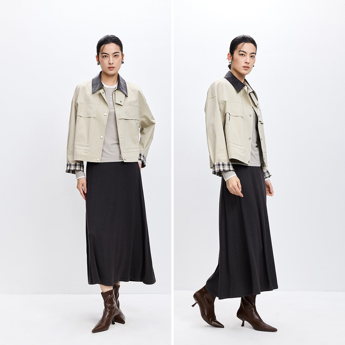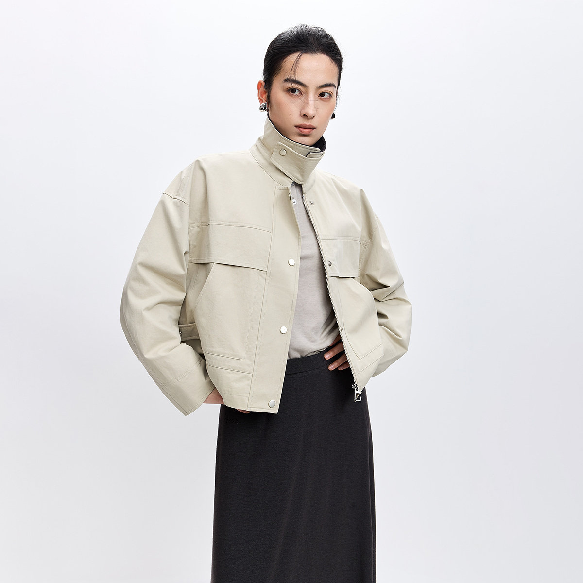 LILY2026春秋新款女装纯棉翻领休闲通勤卡其色上衣工装夹克外套