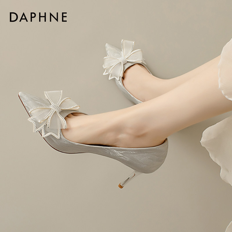 达芙妮细跟高跟鞋女2025秋季新款蝴蝶结新娘婚鞋通勤尖头银色单鞋