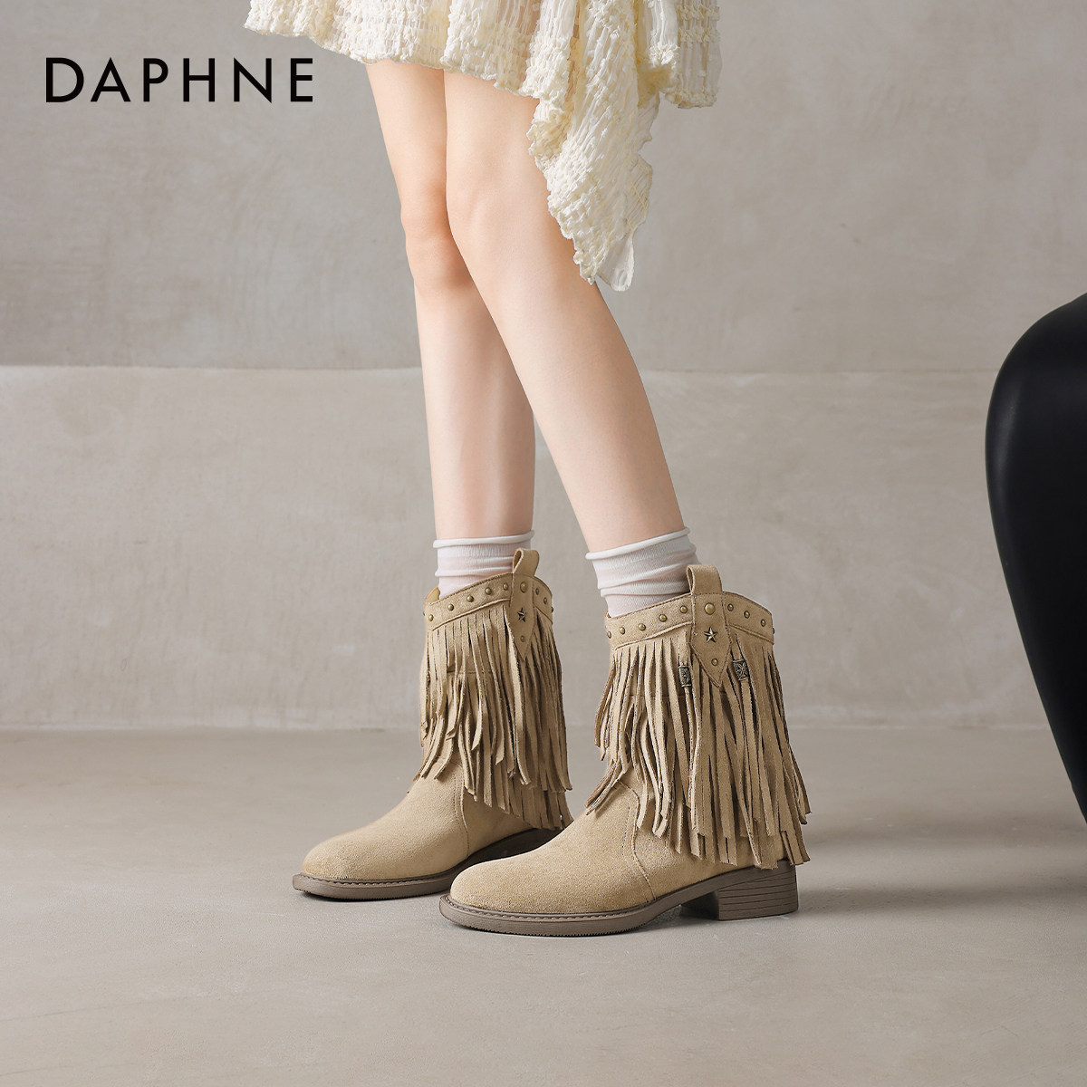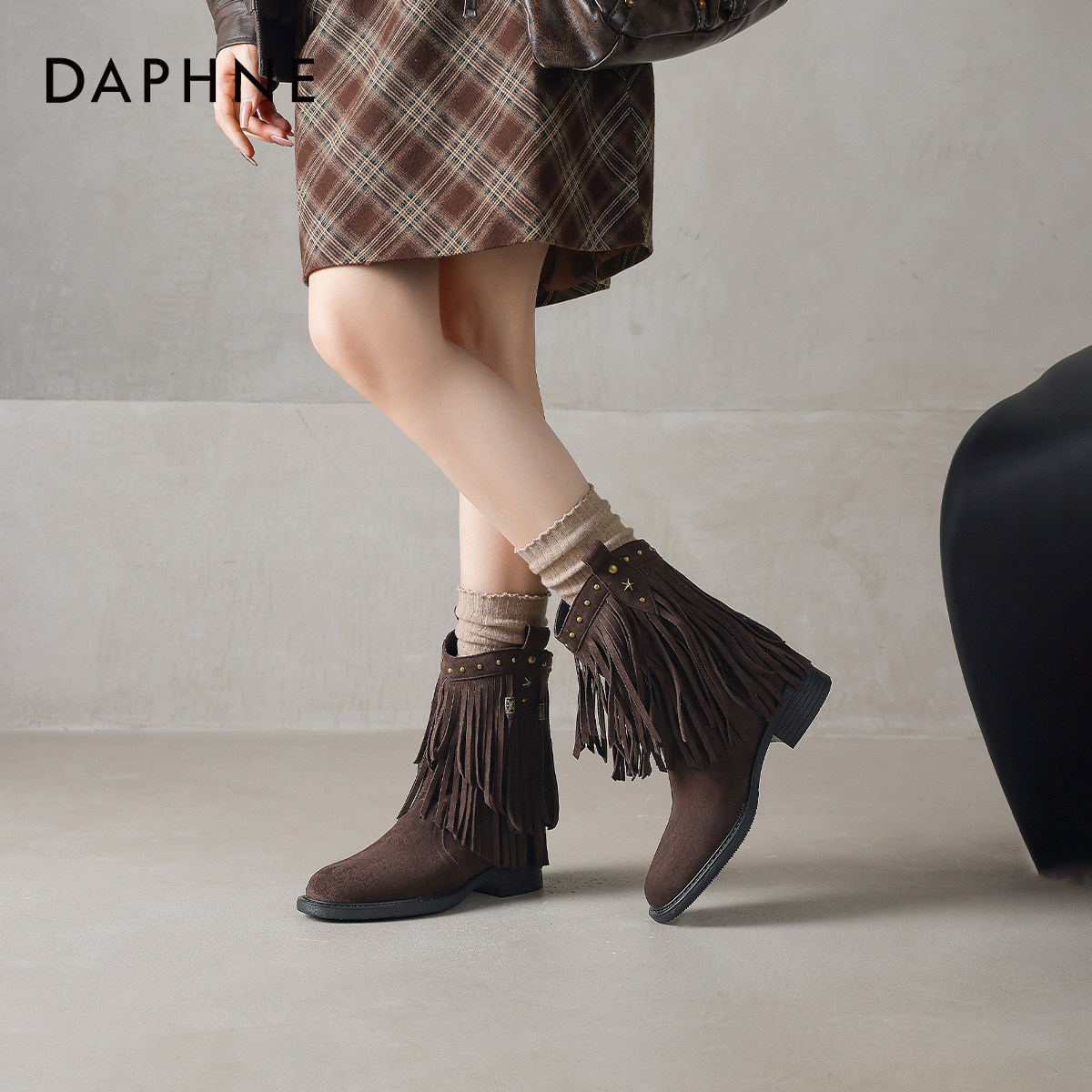 达芙妮流苏短靴女2026新款秋冬季美拉德靴子西部牛仔靴加绒马丁靴