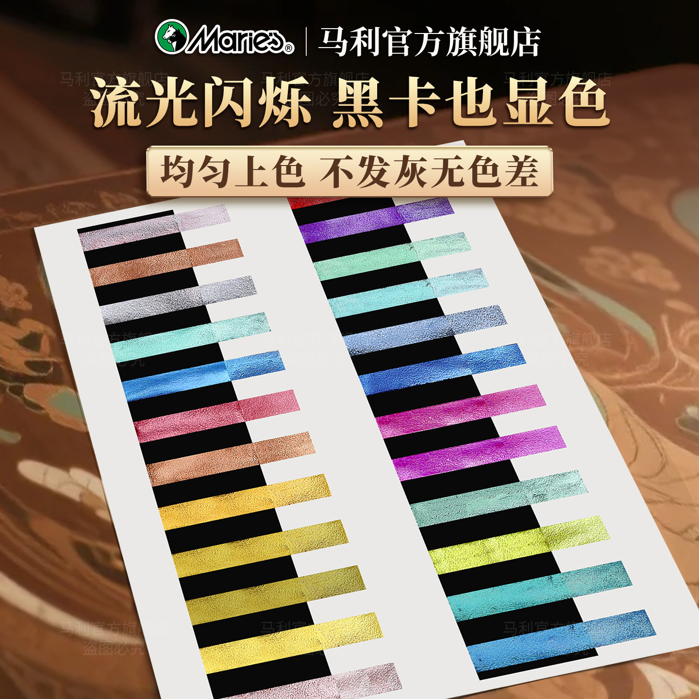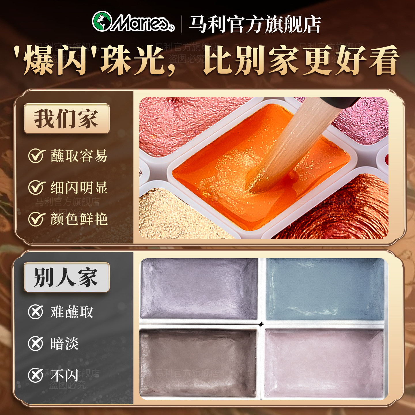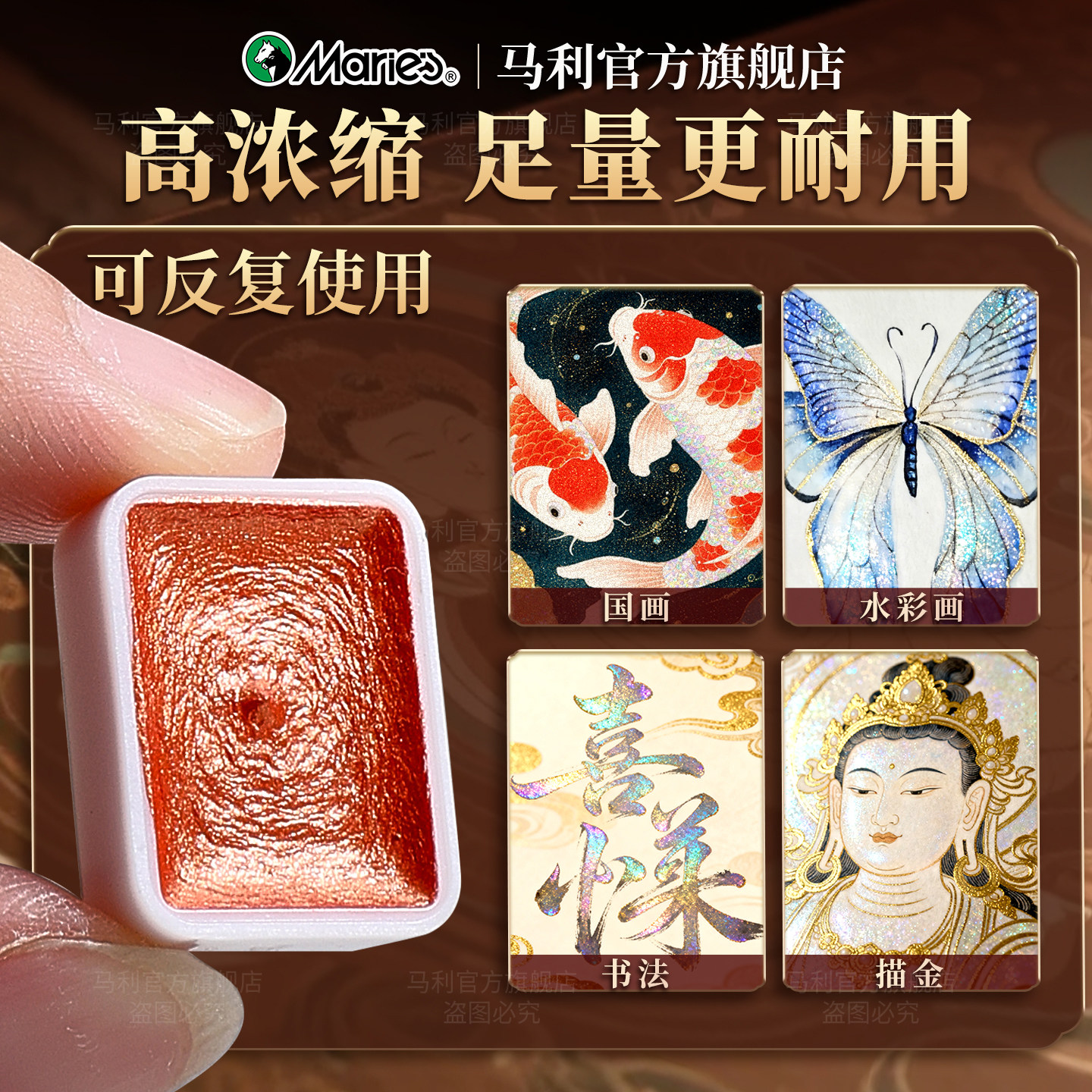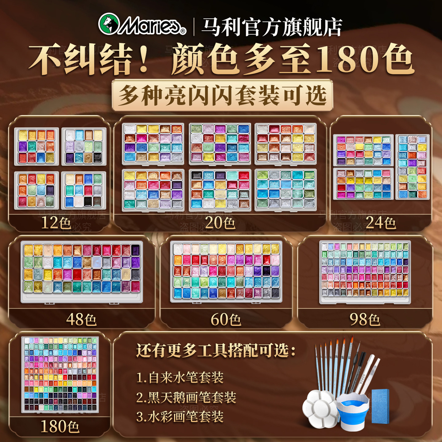 马利牌珠光水彩固体水彩颜料180色敦煌闪粉24色金粉国画美术生专用不透明分装盒旅行水彩画全套装工具
