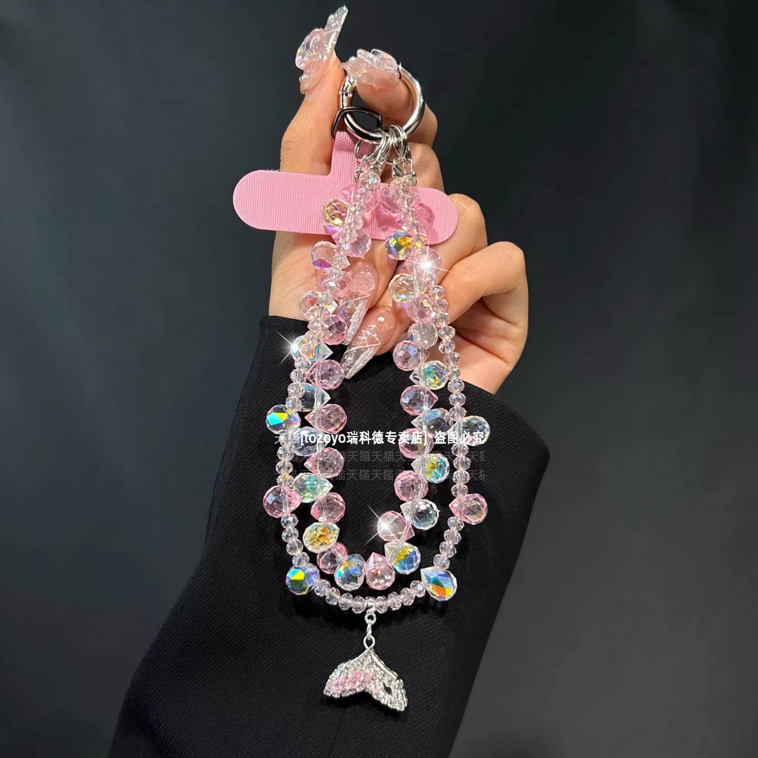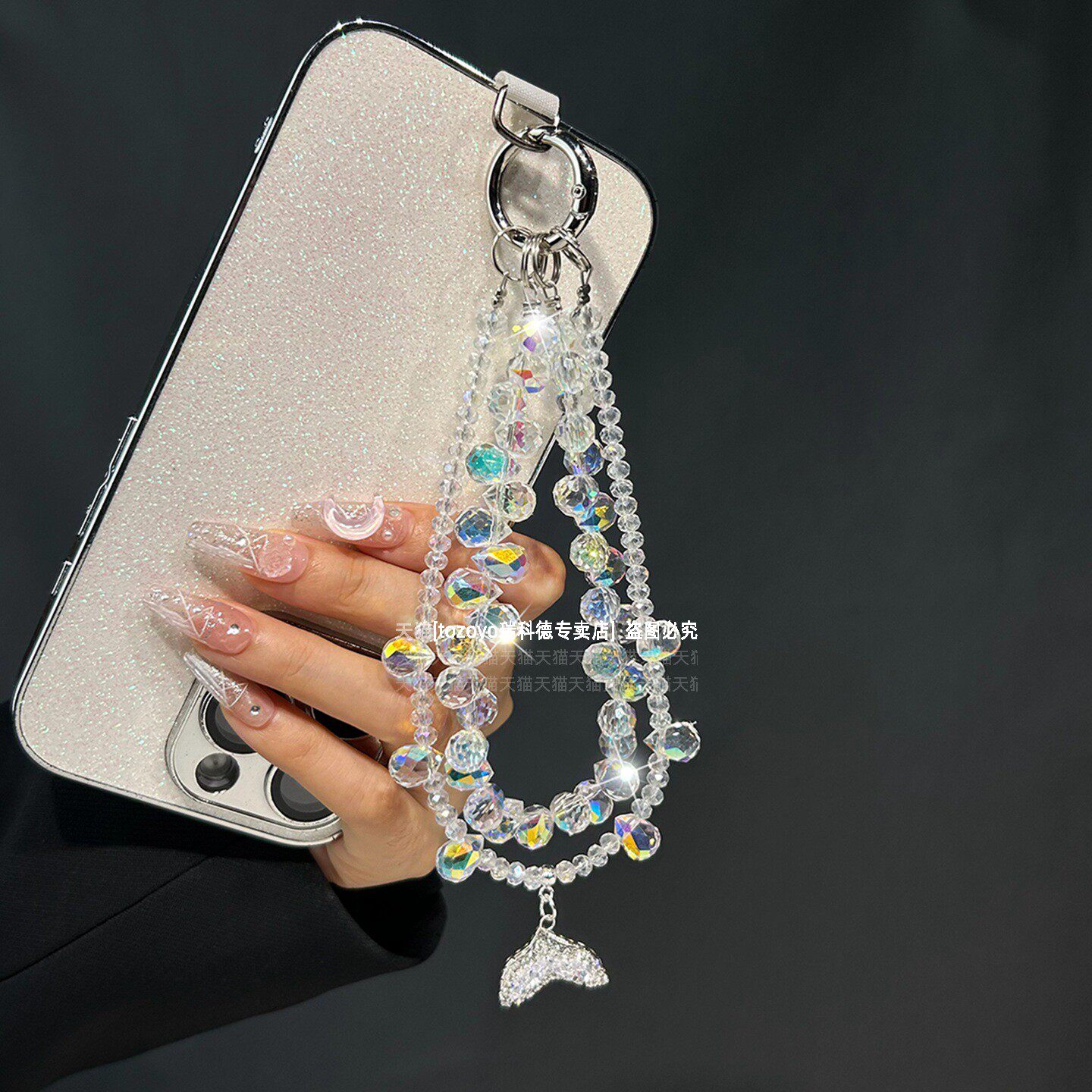 人鱼公主水晶手机链爆闪双层手腕挂链精致高级感串珠手链闪钻鱼尾吊坠高端女挂饰手提链条防丢钥匙扣包挂件壳