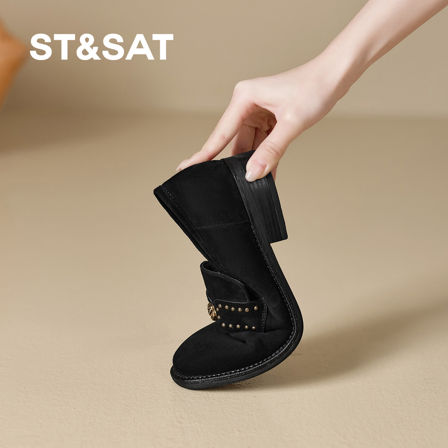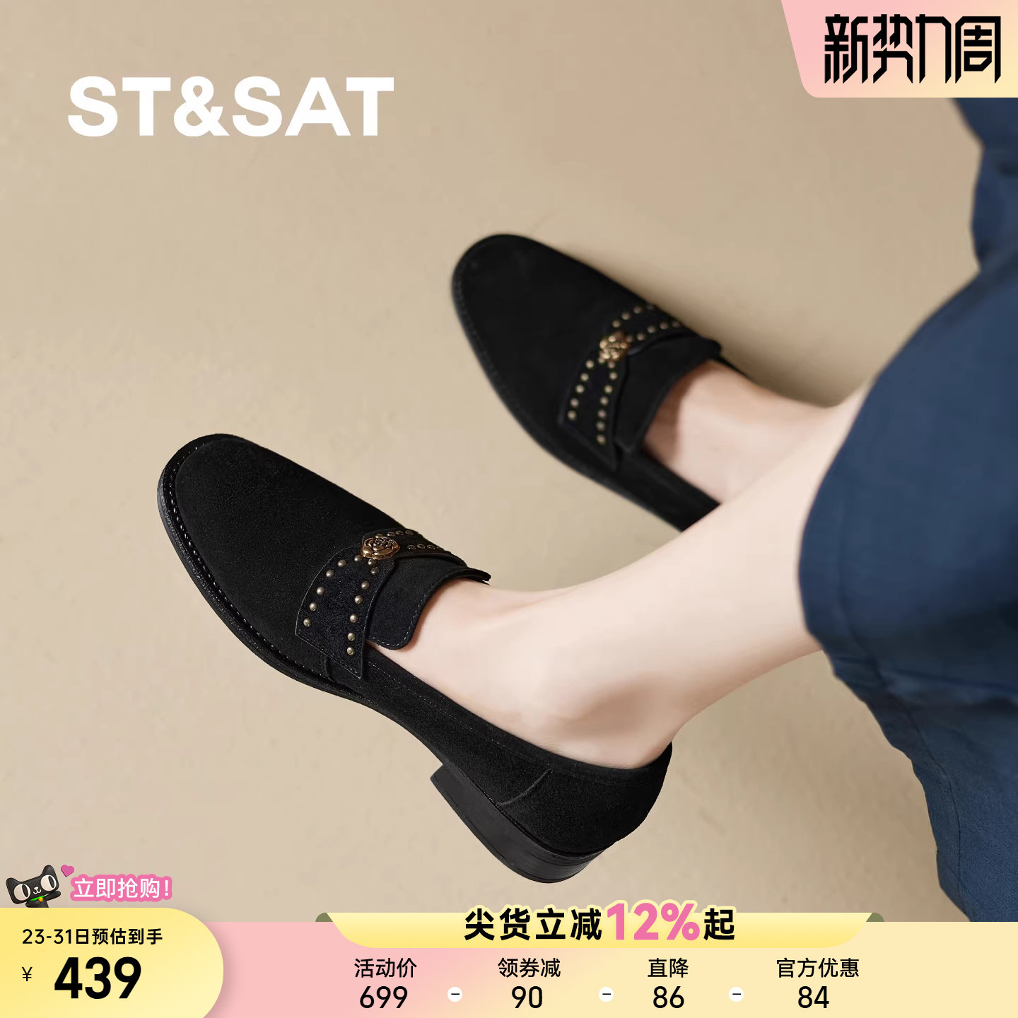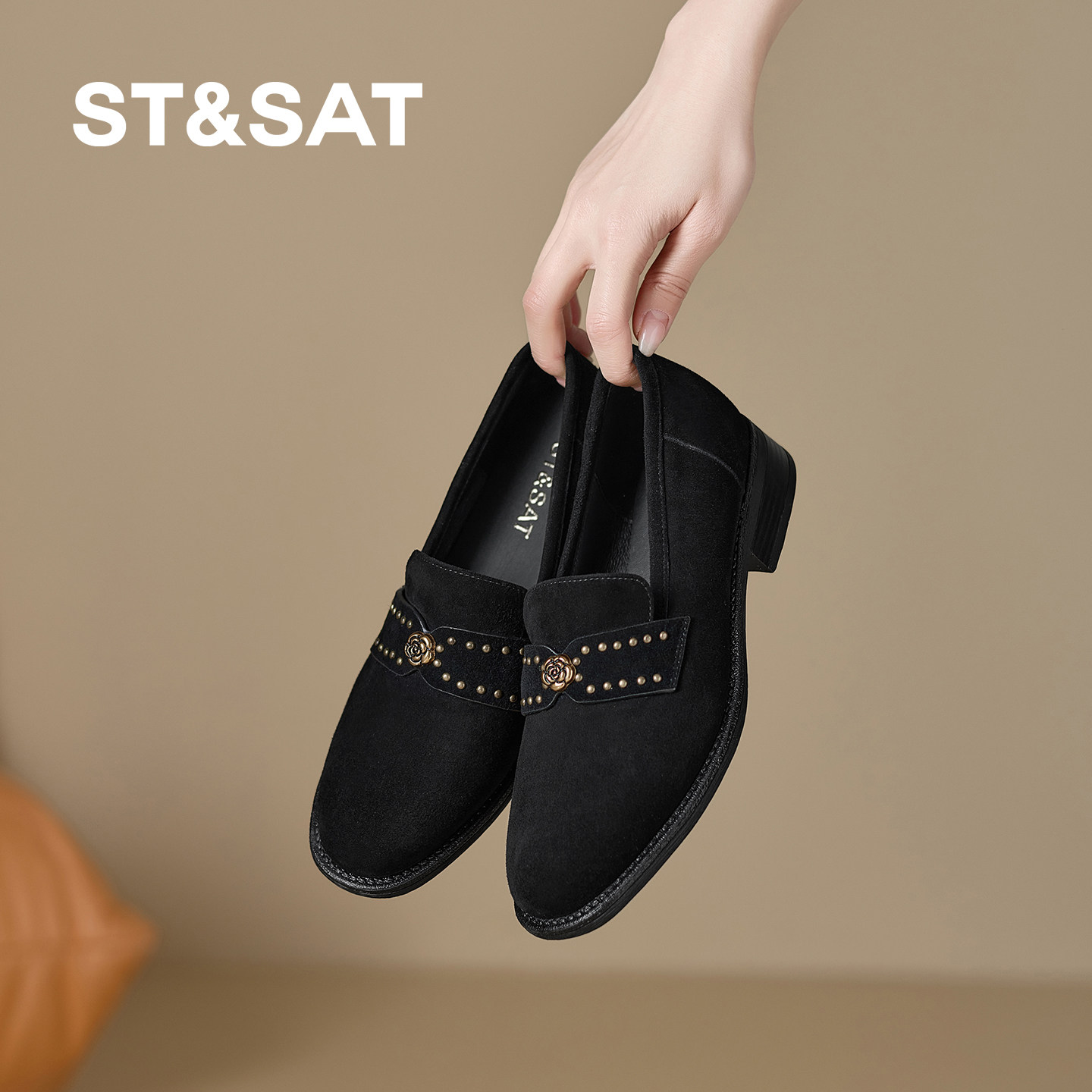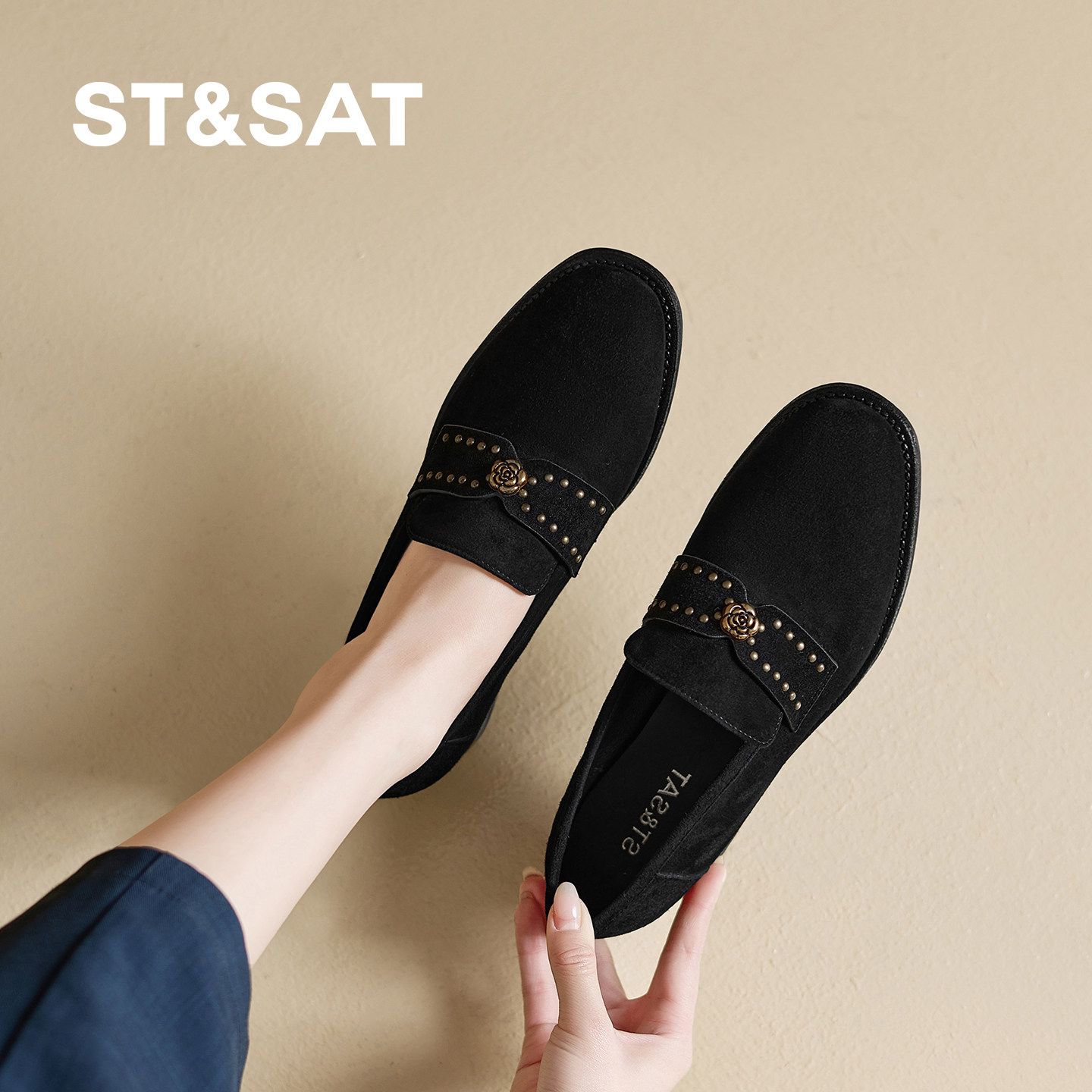 星期六反绒皮乐福鞋女2026春秋新款圆头铆钉金属扣一脚蹬百搭单鞋