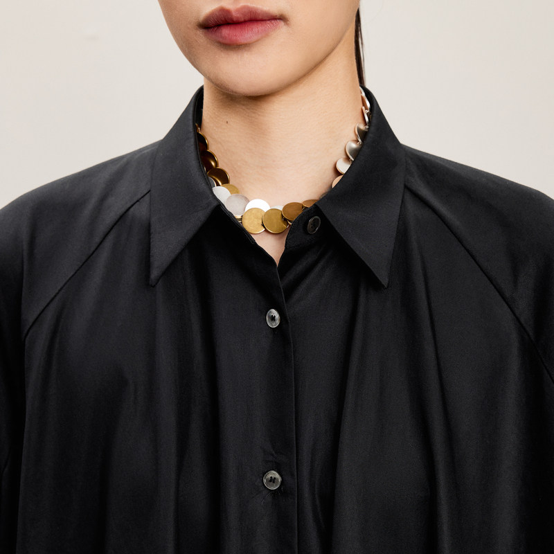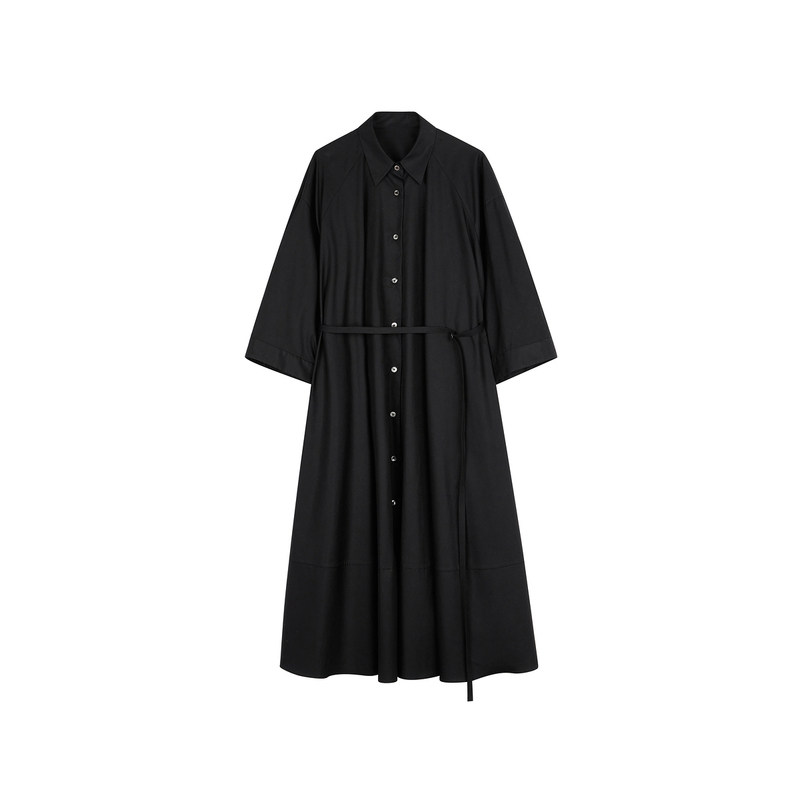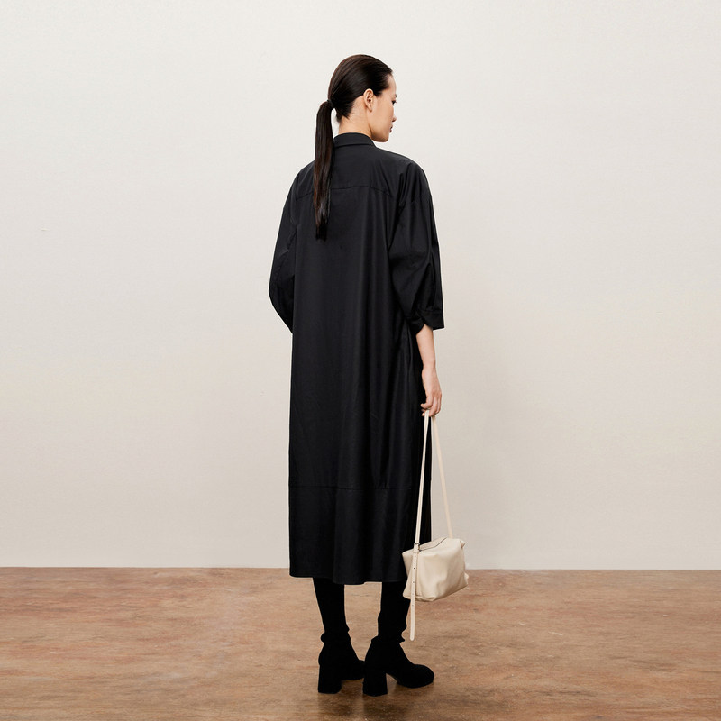 LESS秋冬翻领衬衫连衣裙通勤黑色全棉休闲简约A字长裙2O7G13000