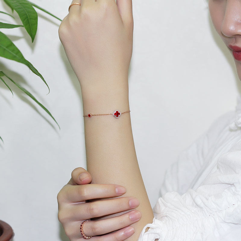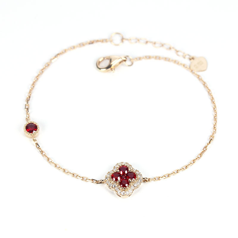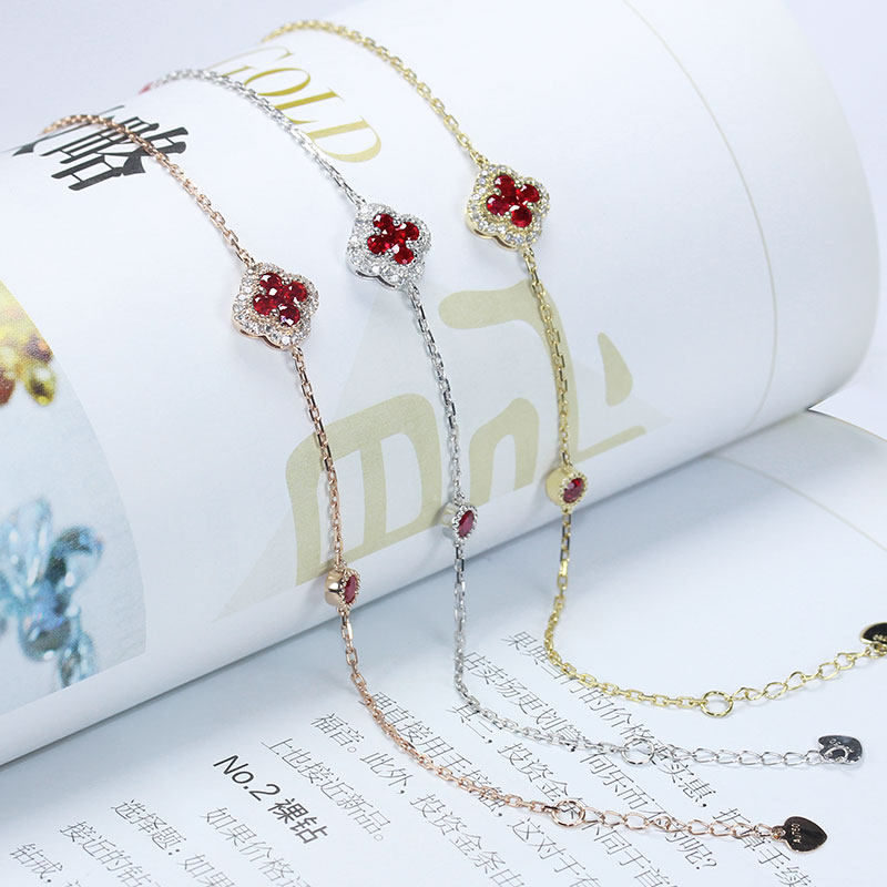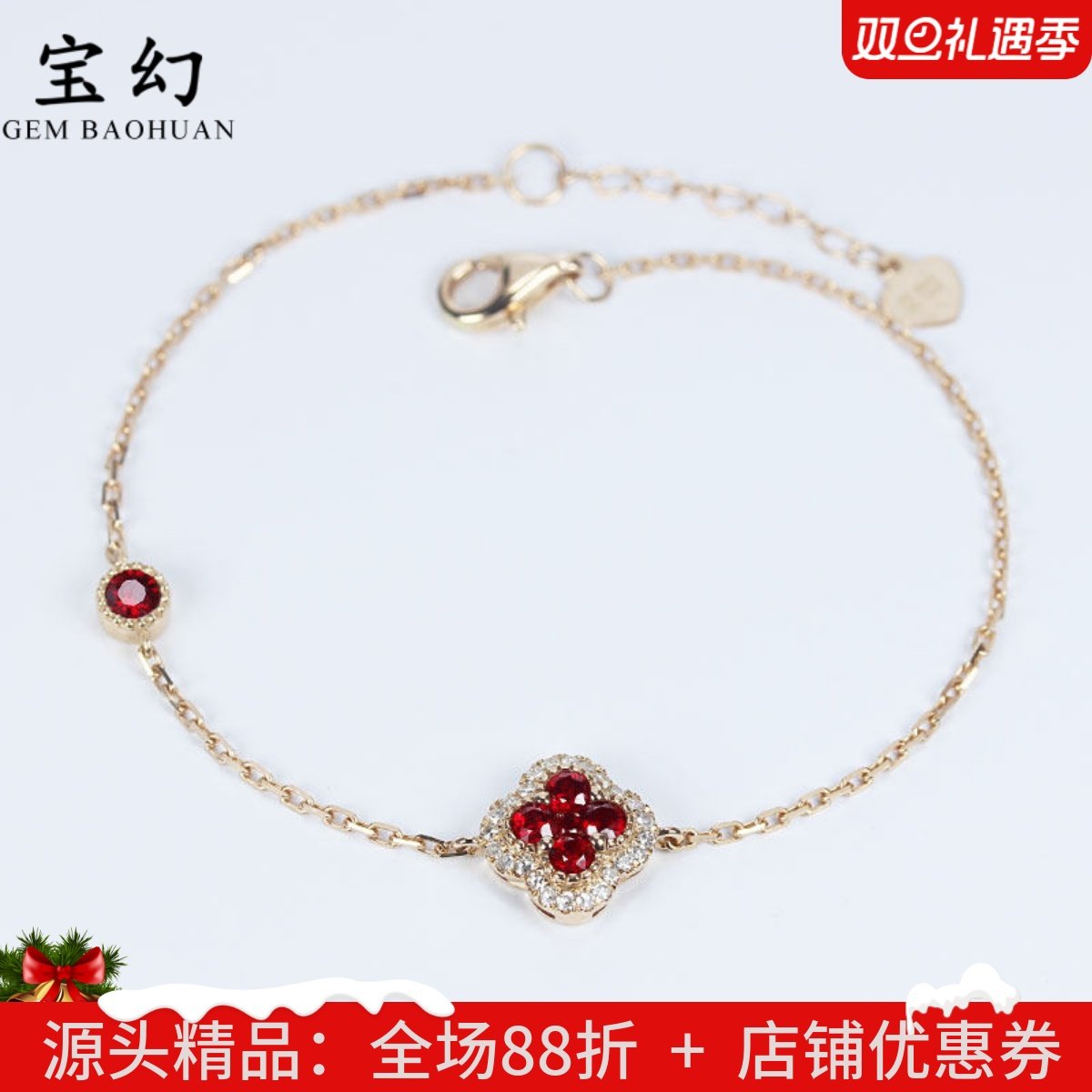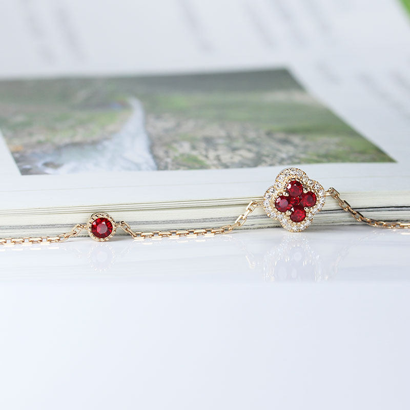 翡宝丽 G18K玫瑰金天然鸽血红宝石四叶草手链 黄金钻石可调节女款