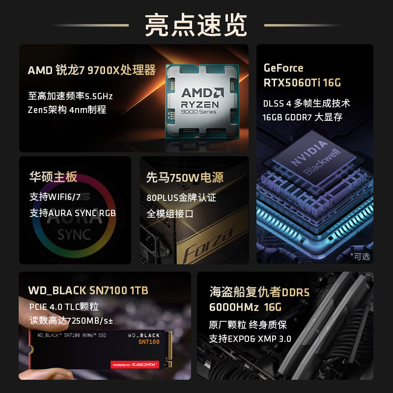 浪AMD锐龙7 9700X/RTX5060Ti/5070/5070Ti/RX9070XT16G游戏整机台式diy组装电脑主机吃鸡台式电脑套件三角洲