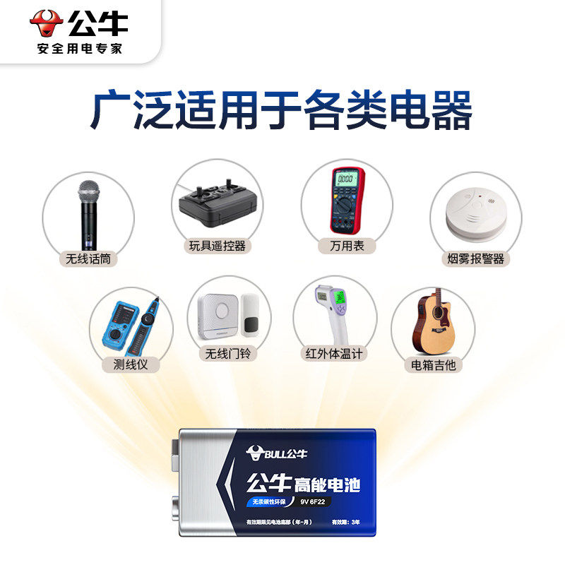 公牛9伏方块电池6f22方形叠层万用表专用电池无线话筒麦克风玩具遥控吉他对讲机体温枪烟感器测线仪9V干电池