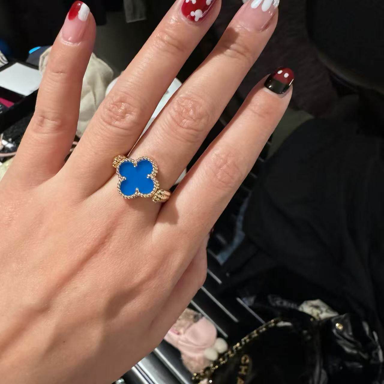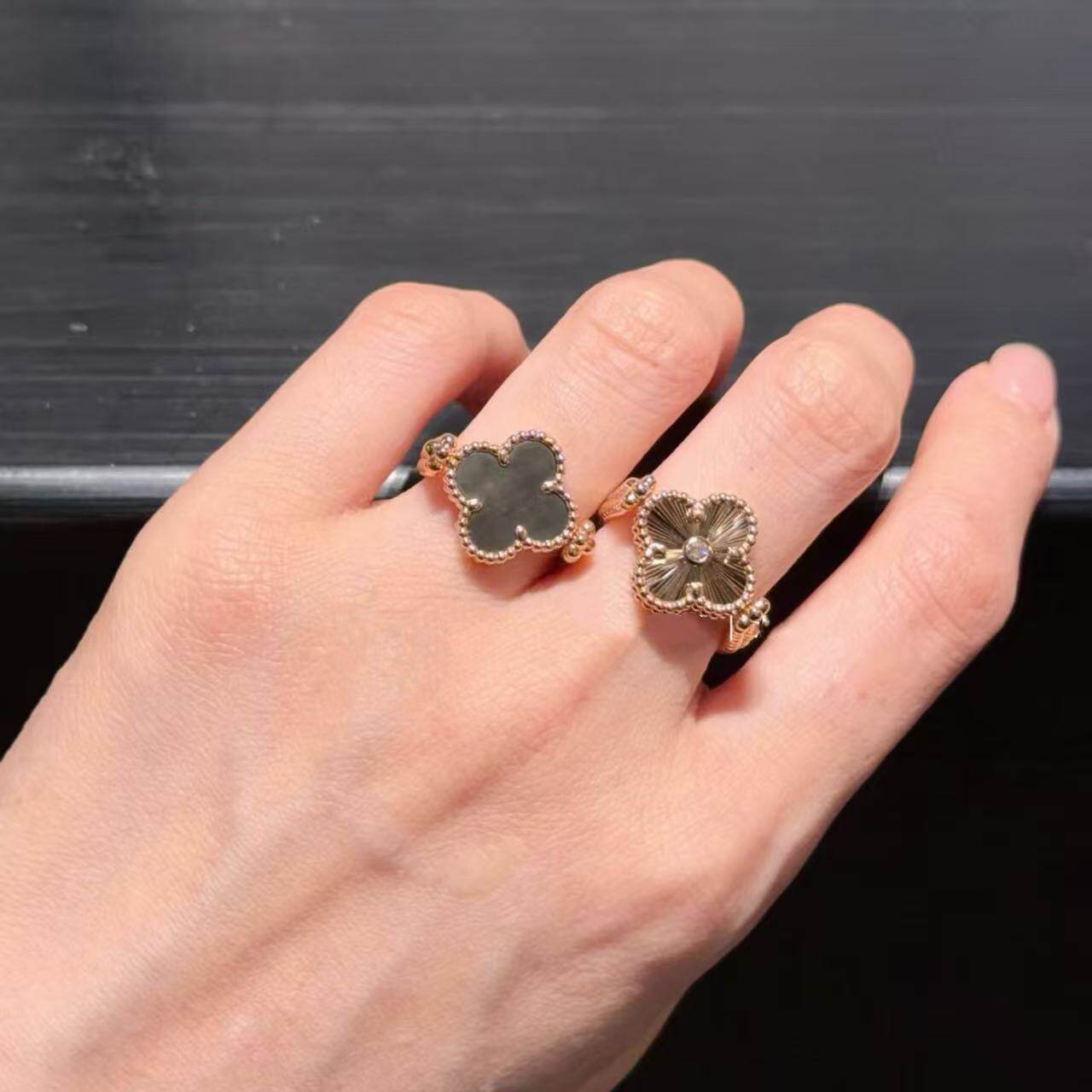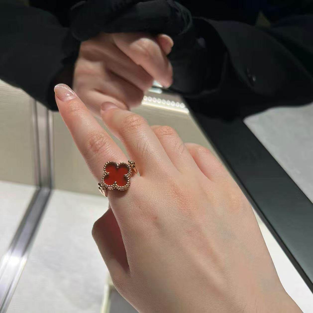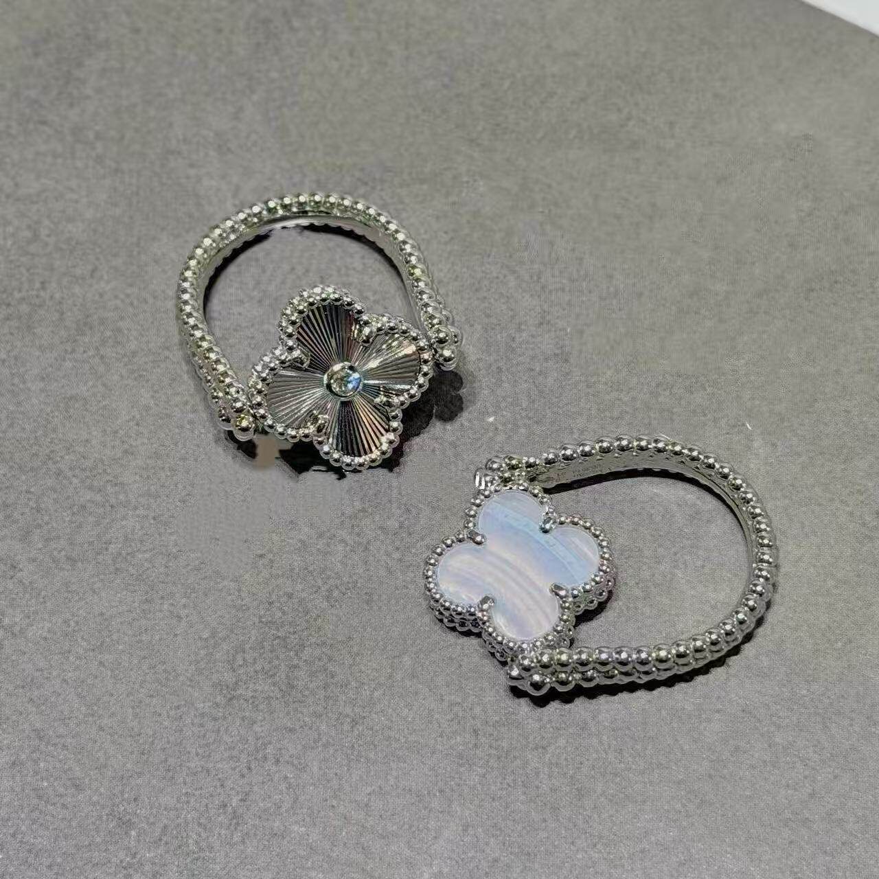 原单高定品质红玛瑙双面四叶草戒指紫玉髓蓝玛瑙灰贝母可翻转镭射