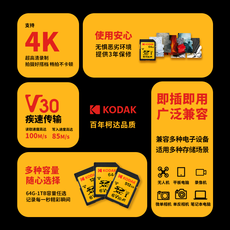 柯达V30高速相机内存卡64G数码相机sd储存卡高清4K单反128g闪存卡