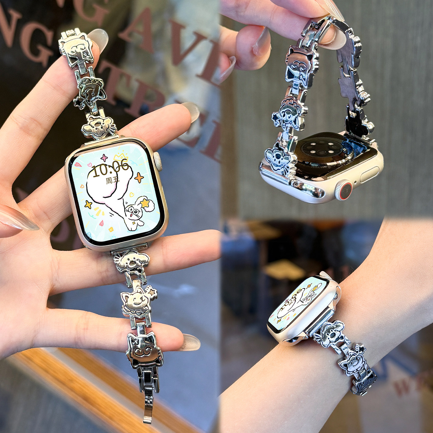 适用苹果手表s11表带小猫钢带s10夏季新款s9小米手环pro卡通小狗S8金属印花S7透气ultra3女高级链腕带银色
