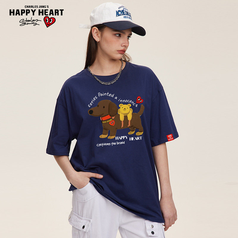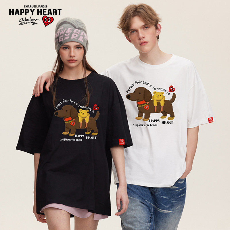 查尔斯桃心 可爱狗印花短袖t恤男夏季新款透气纯棉休闲圆领情侣款