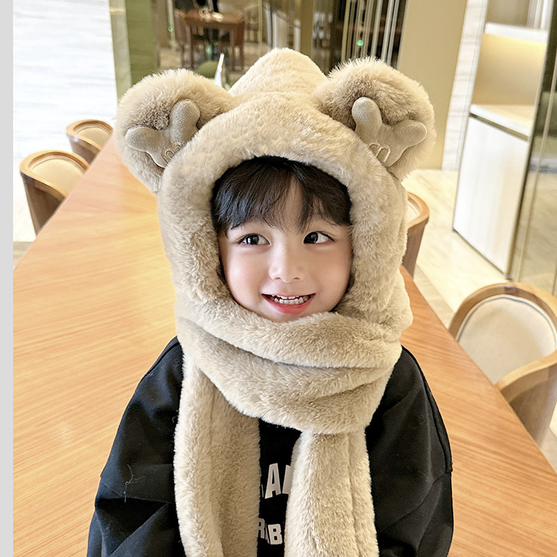 尼多熊儿童帽子围巾一体冬季防风帽宝宝毛绒护耳帽女童加厚保暖帽