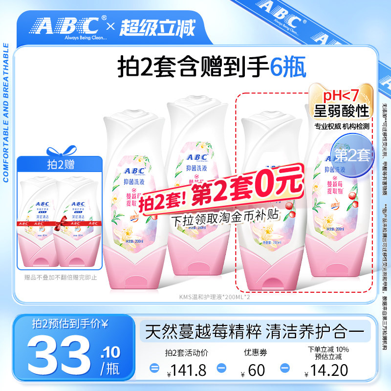 ABC女性护理液卫生洗护液小花朵温和不刺激私处蔓越莓200ML2瓶