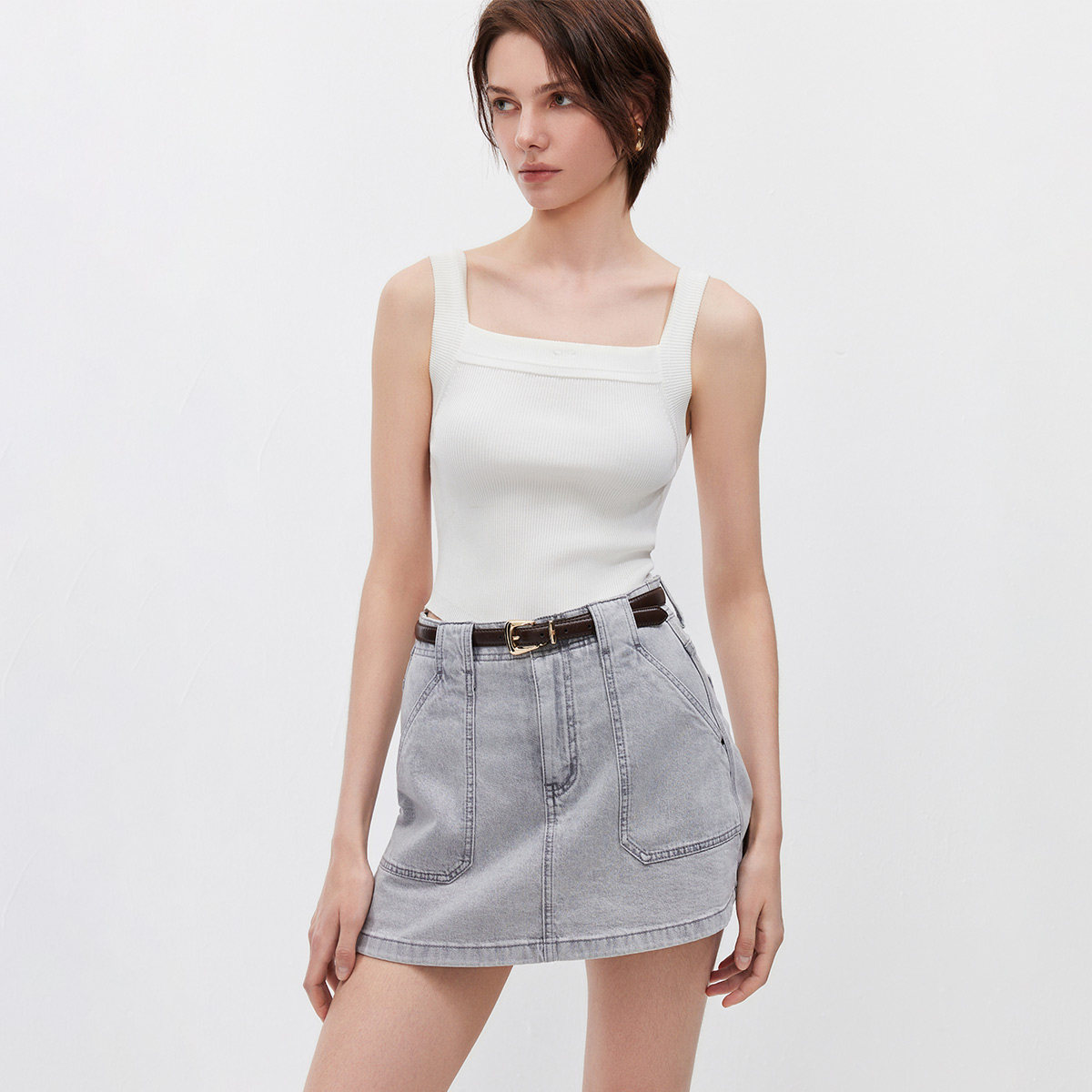 对称明线口袋,高腰牛仔短裙裤