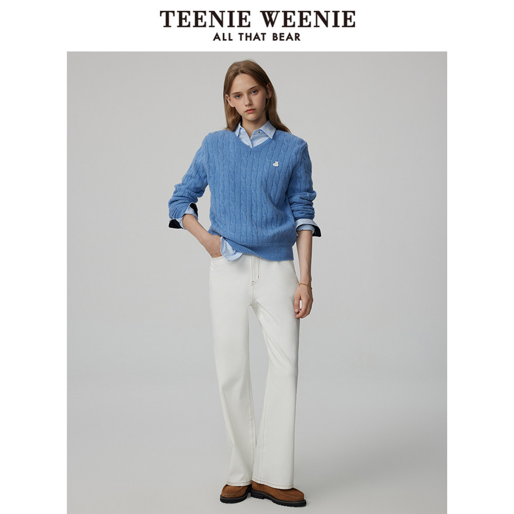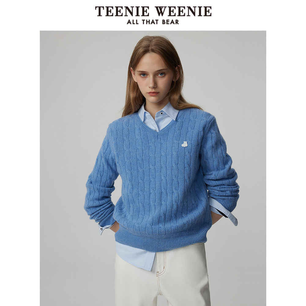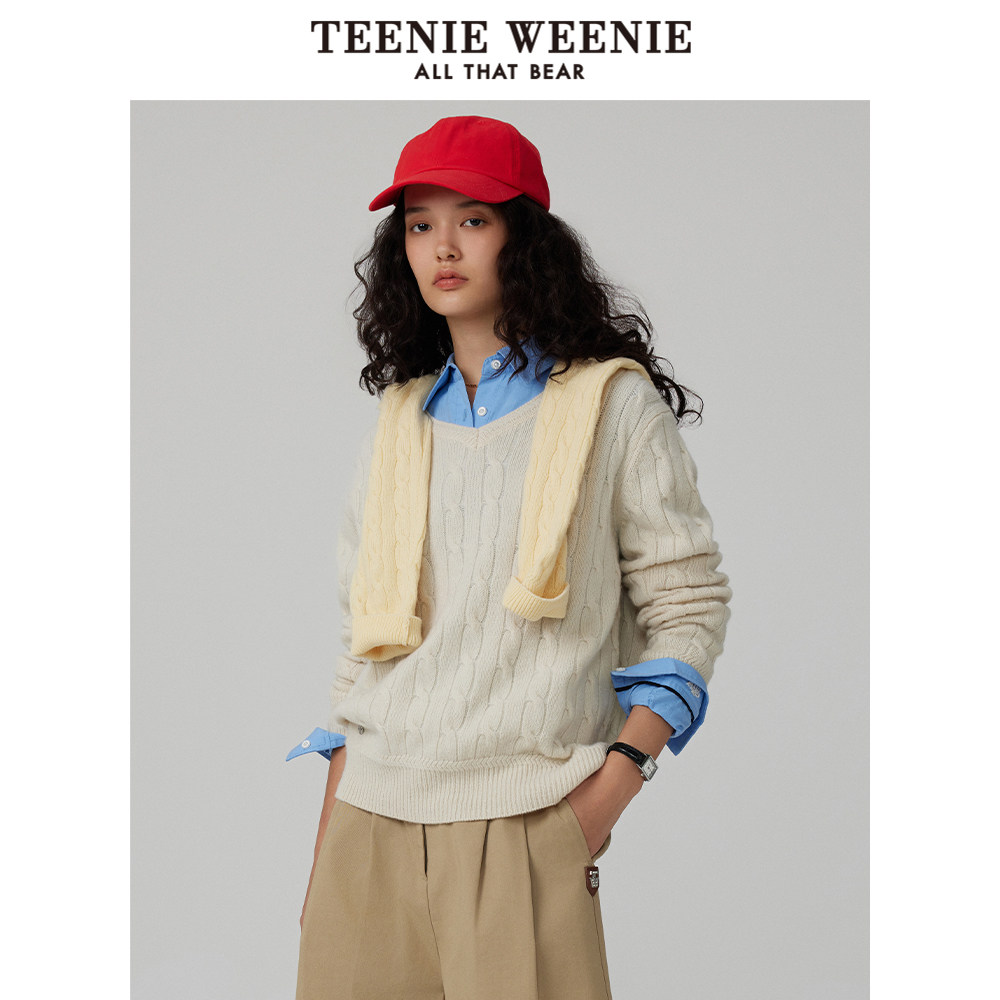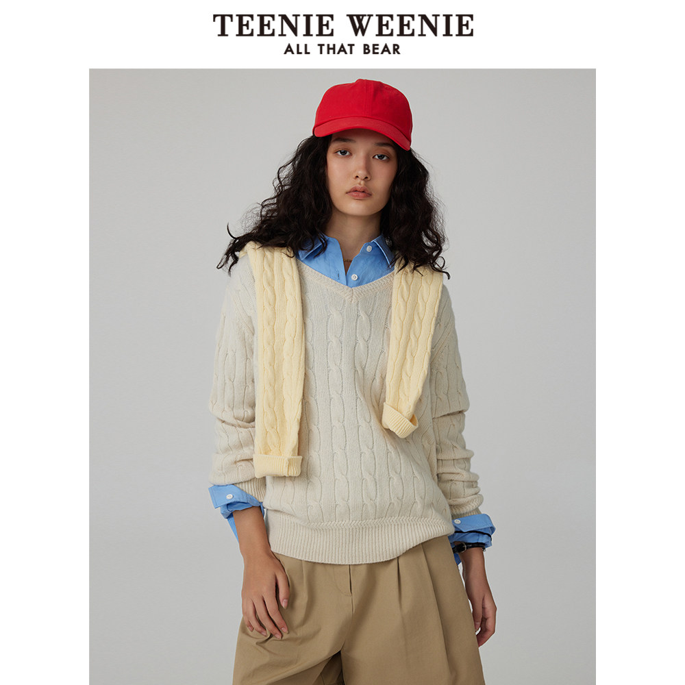 TeenieWeenie小熊奥莱女装冬装v领绞花牦牛绒毛衣针织衫质感软糯