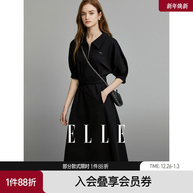 ELLE黑色POLO领设计感连衣裙女2025夏季新款高腰显瘦高级感裙子