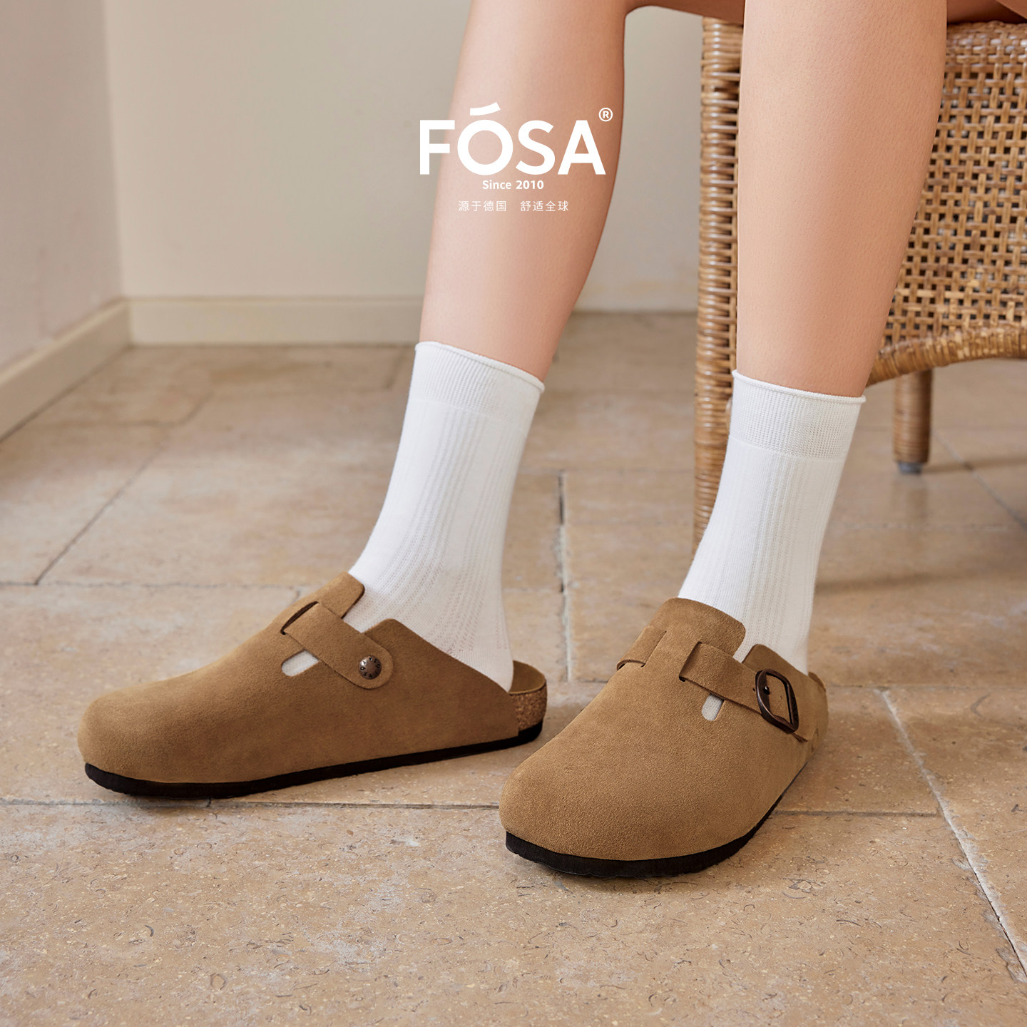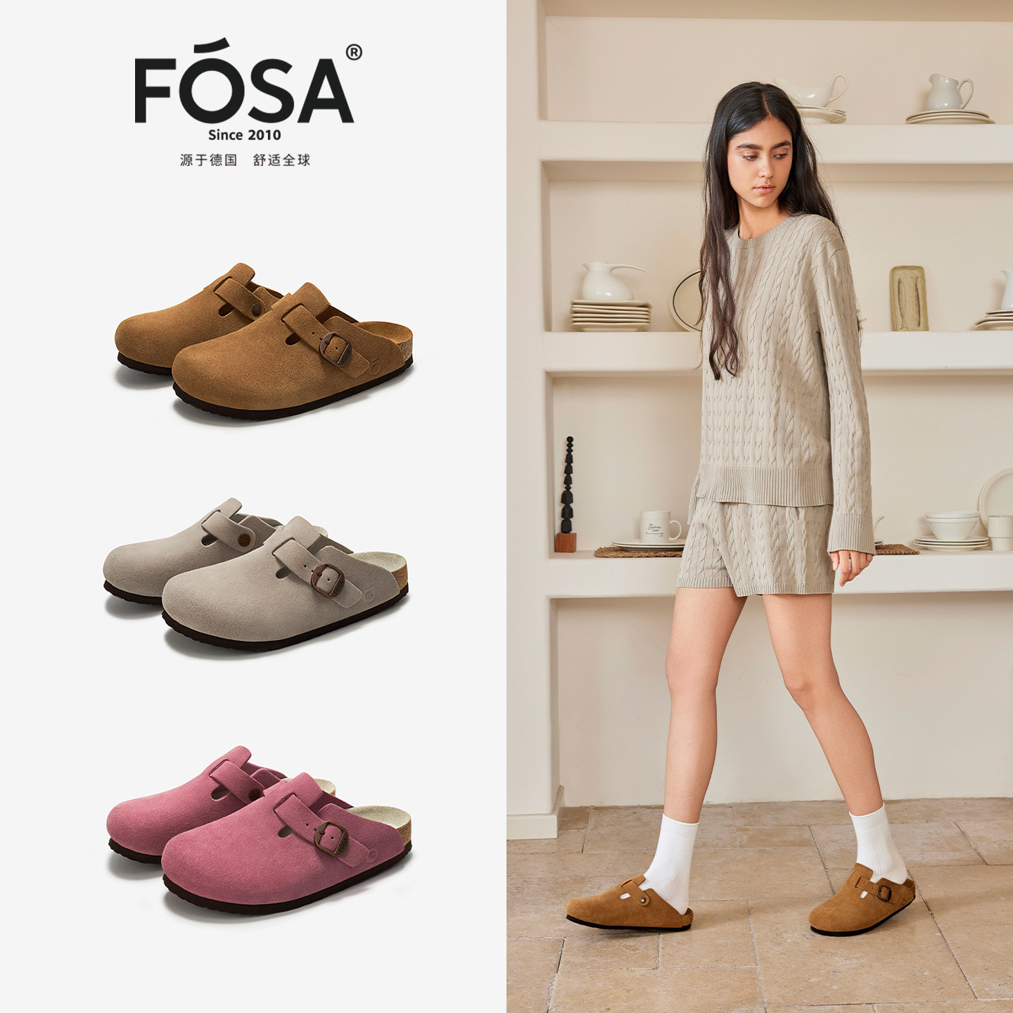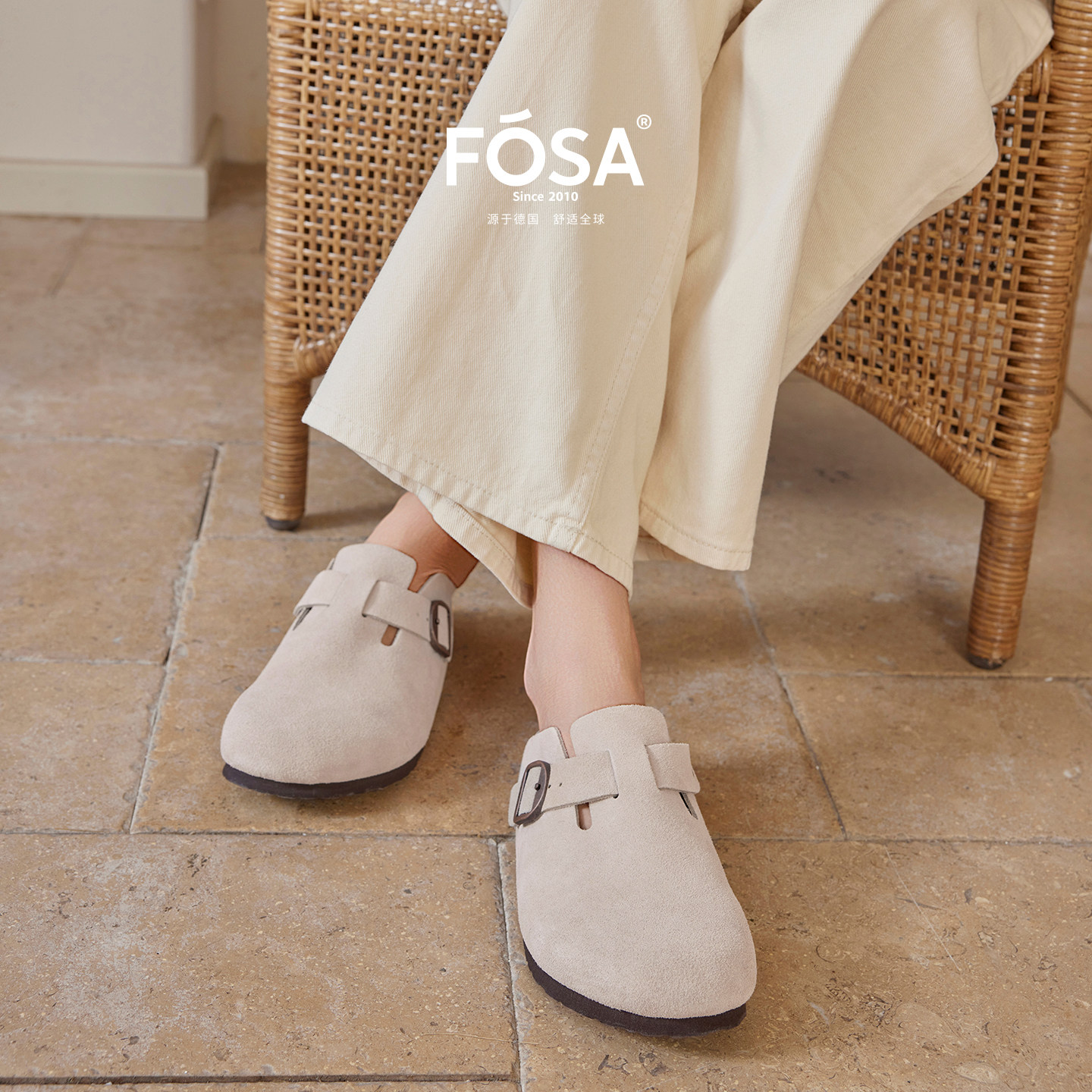 FOSA女鞋软木半拖鞋包头鞋男女同款真皮牛皮2025新款一脚蹬勃肯鞋