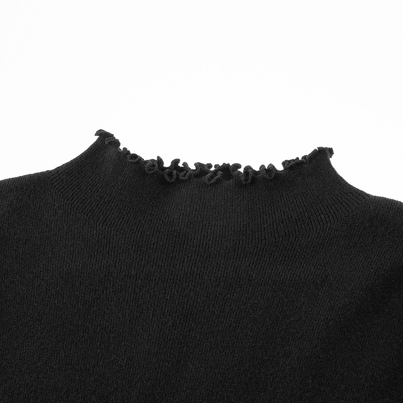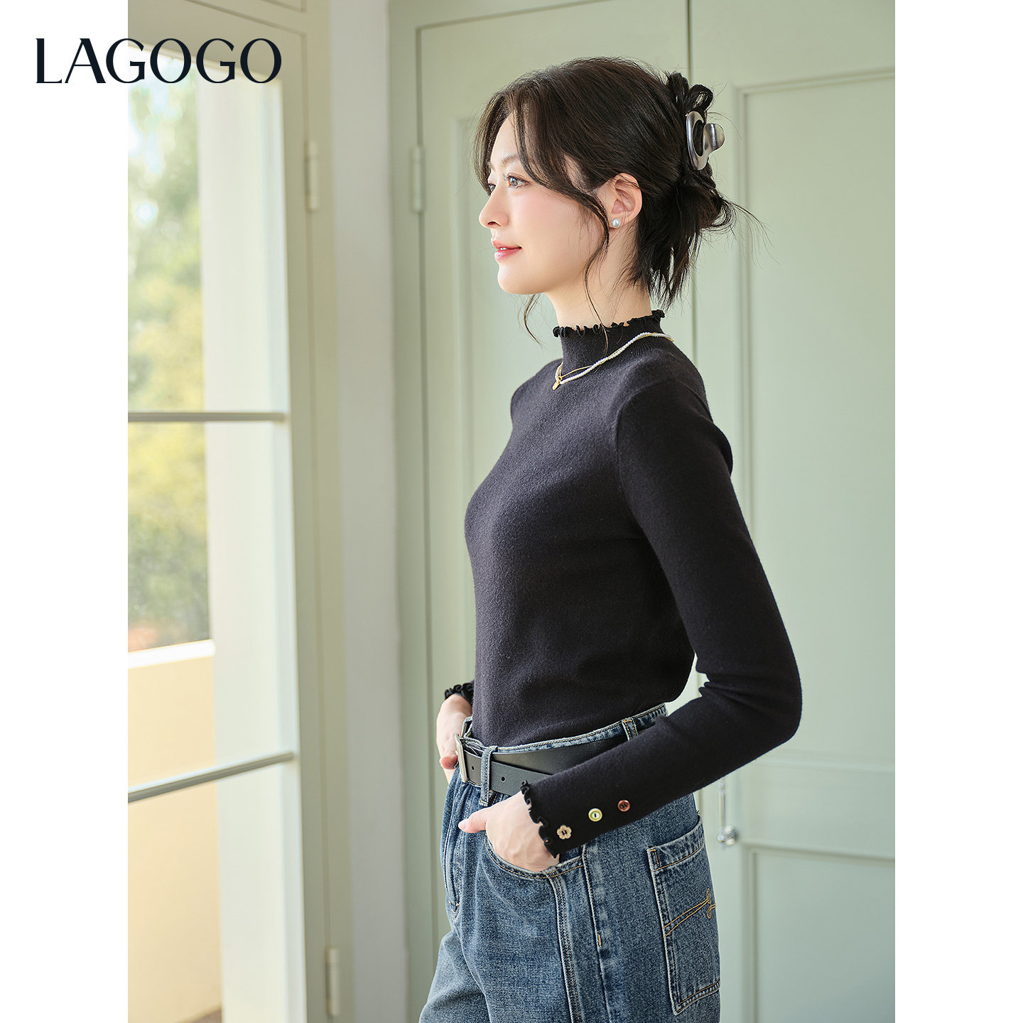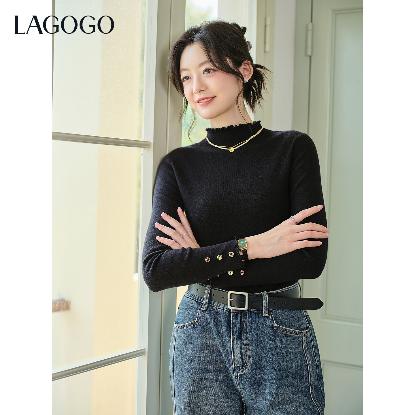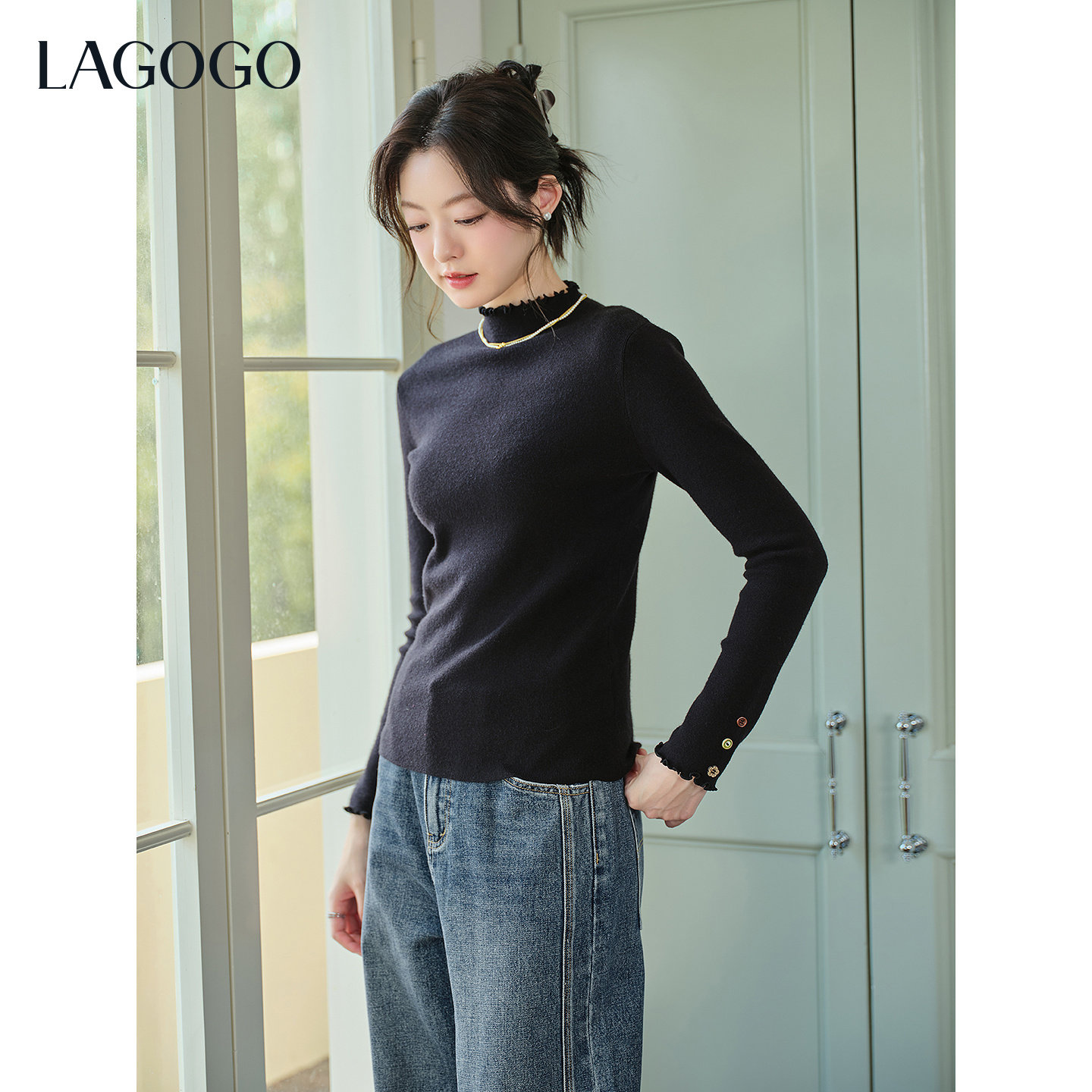 LAGOGO彩虹方糖木耳边黑色毛衣女拉谷谷2025冬新款百搭打底针织衫