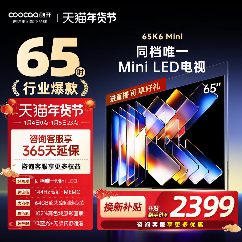 创维酷开65K6 Mini LED家用液晶高清电视机2025新款以旧换新补贴