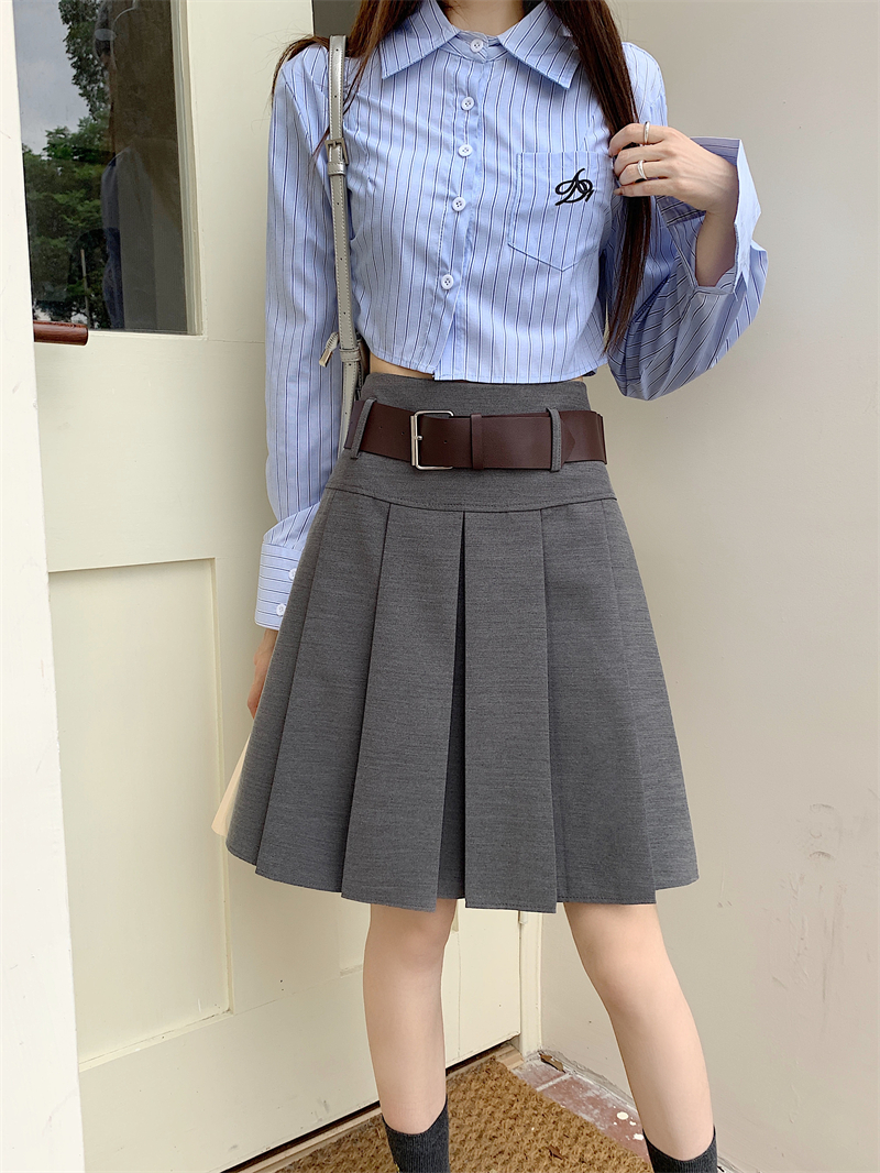 MJ STYLE灰色百褶西装裙女秋冬半身裙高腰休闲大摆a字过膝中长裙