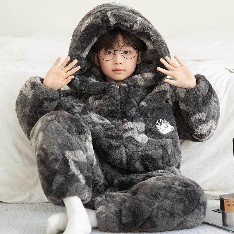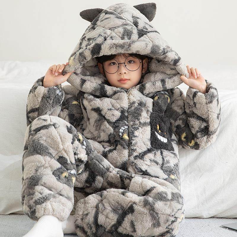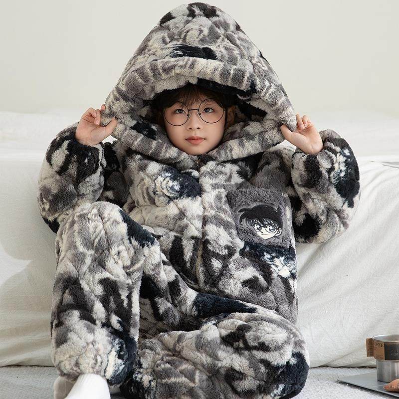 小黑托昵男女童连帽睡衣套装半边绒儿童家居服冬款加绒加厚空调服
