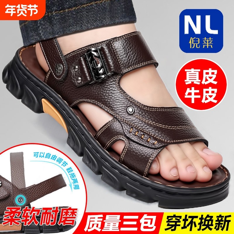 倪莱防滑凉鞋男真皮夏季男士开车沙滩鞋软底头层牛皮凉拖鞋子两用