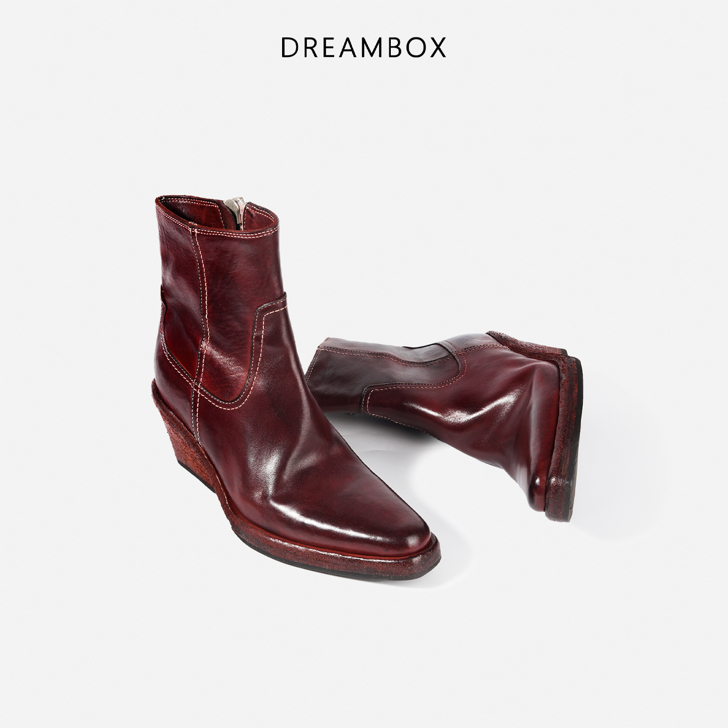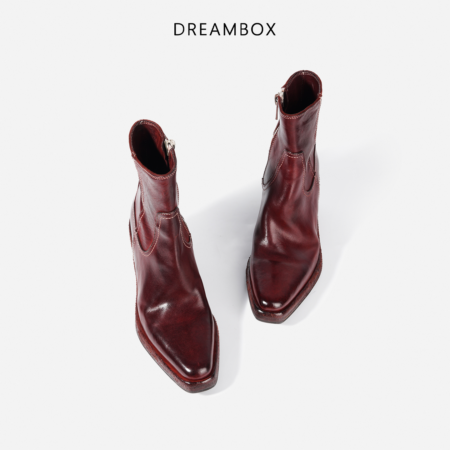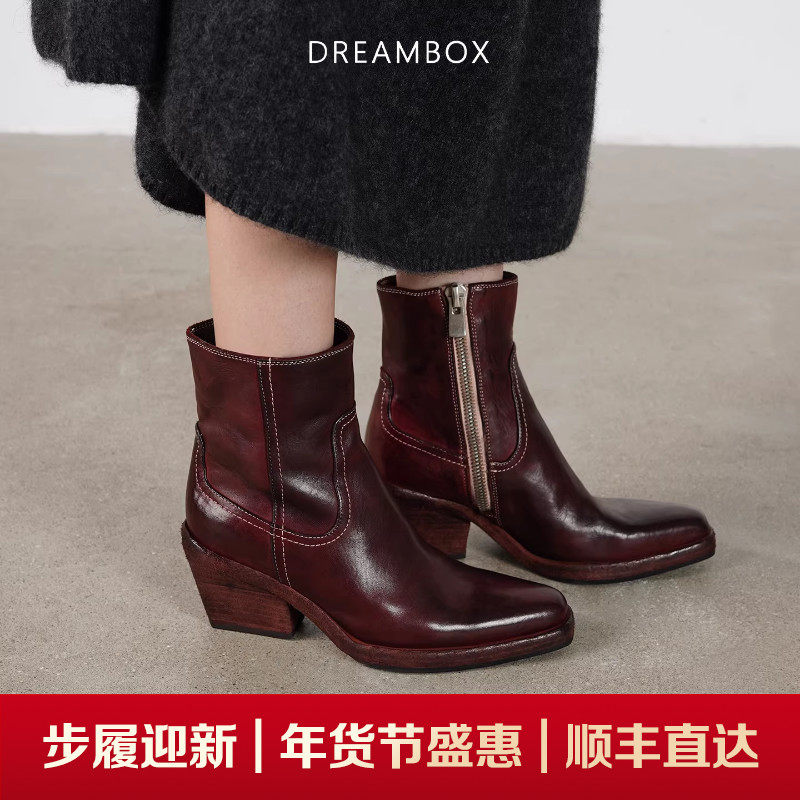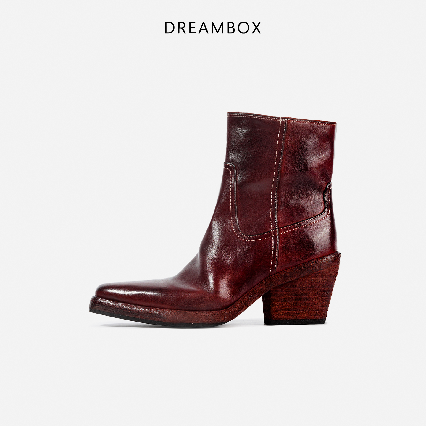 DREAMBOX钧博粗跟气质女靴水洗马皮尖头切尔西靴厚底增高洋气靴子