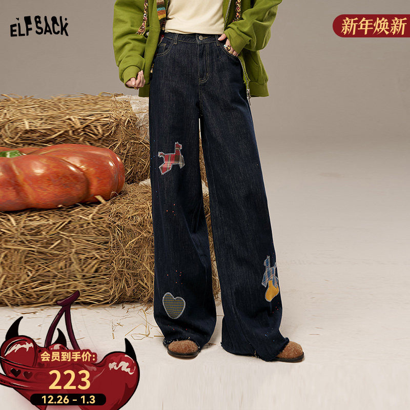 妖精的口袋复古贴布绣高腰直筒牛仔裤女2025秋冬新款显瘦阔腿裤子