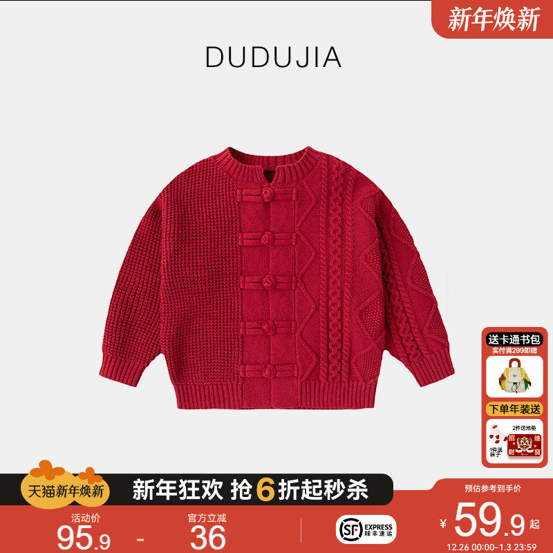 女童新中式拜年服针织衫冬装新款女宝唐装毛衣冬季女孩红色毛线衣
