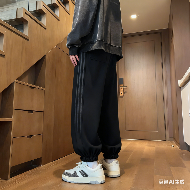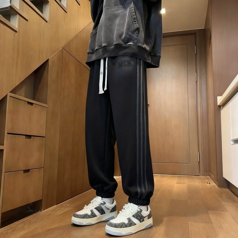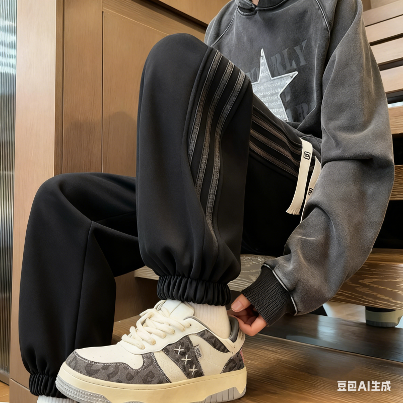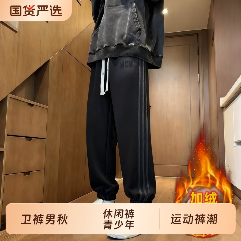 卫裤男秋冬季新款美式加绒加厚直筒休闲裤青少年条纹运动裤潮