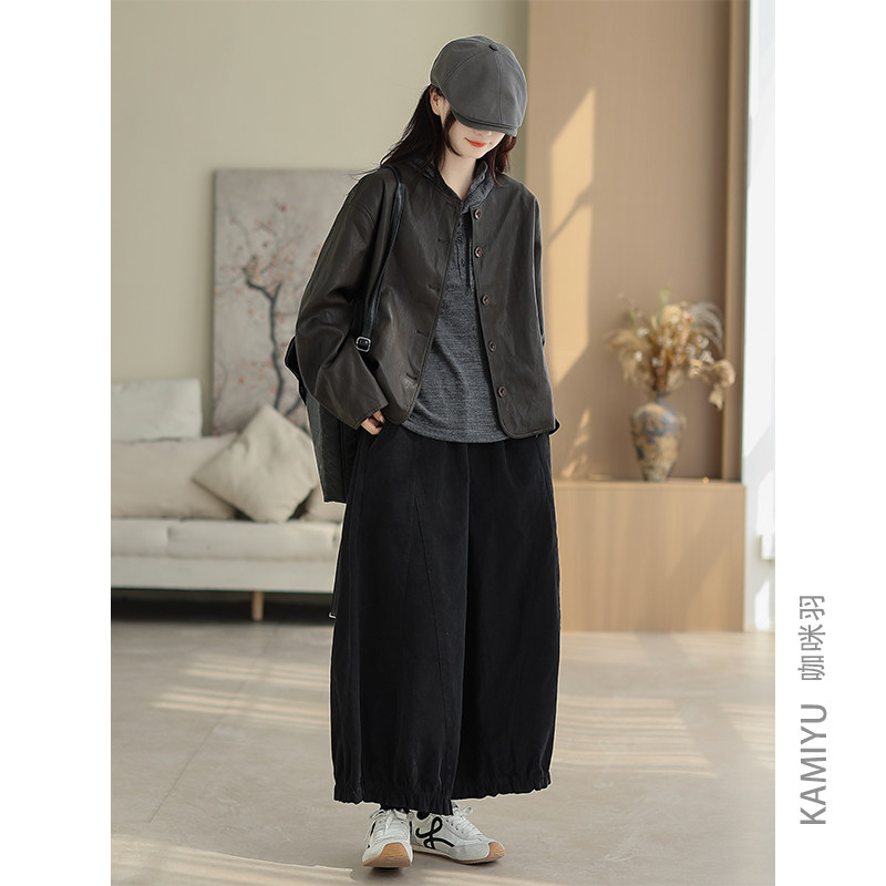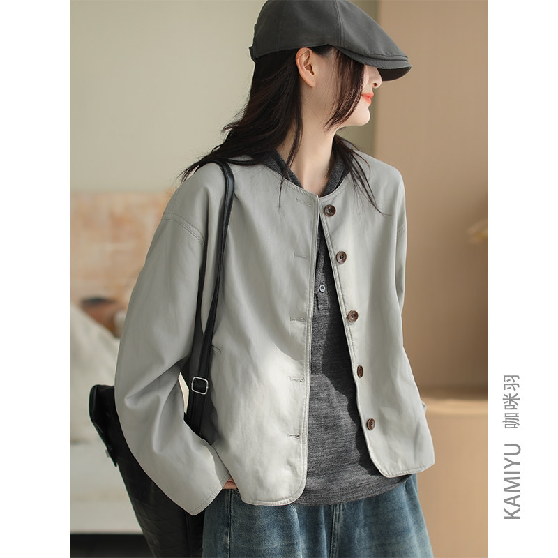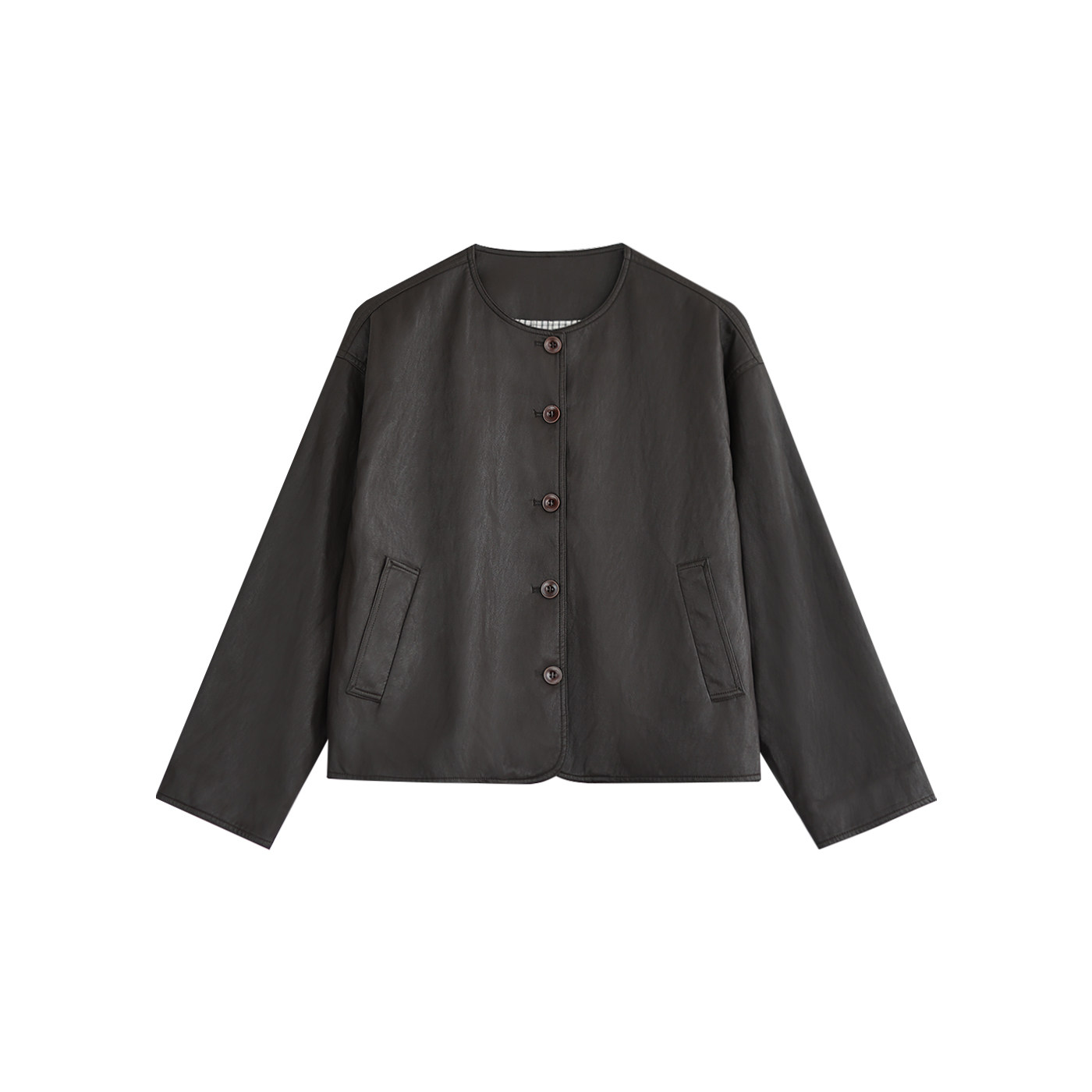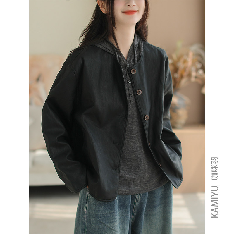 咖咪羽秋款时尚PU皮暗扣外套2025春秋百搭洋气圆领显瘦上衣女