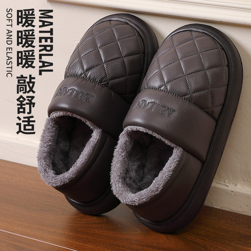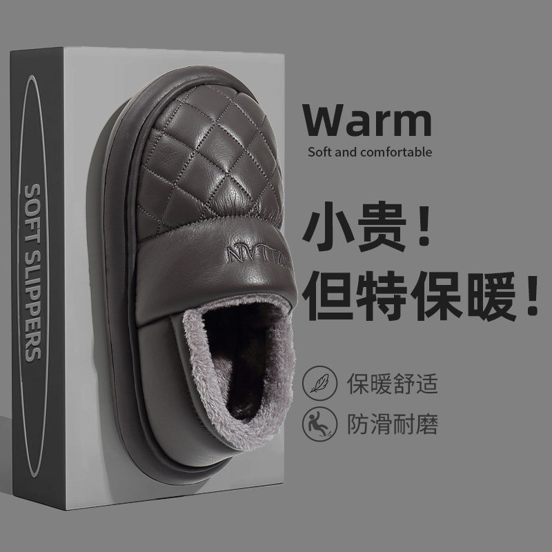 老人棉拖鞋女包跟冬季防水防滑厚底情侣加绒保暖带跟皮面男士棉鞋