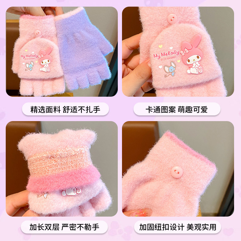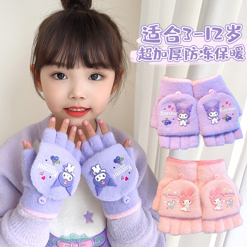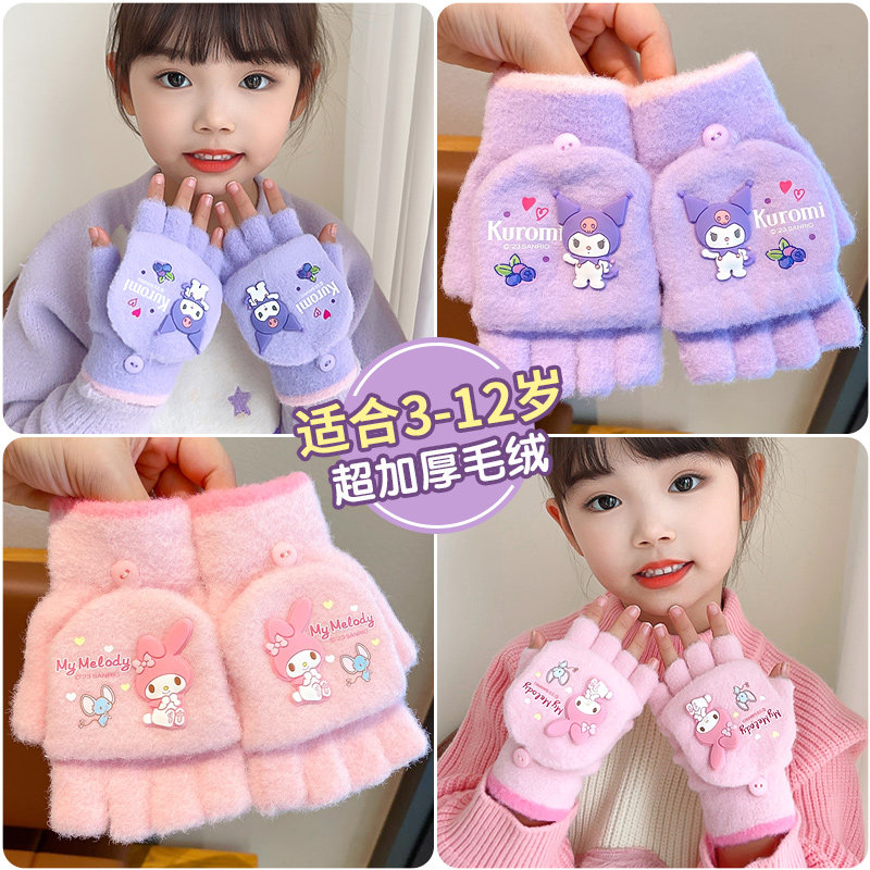 儿童手套女童秋冬季保暖可爱小孩卡通库洛米半指翻盖宝宝五指写字