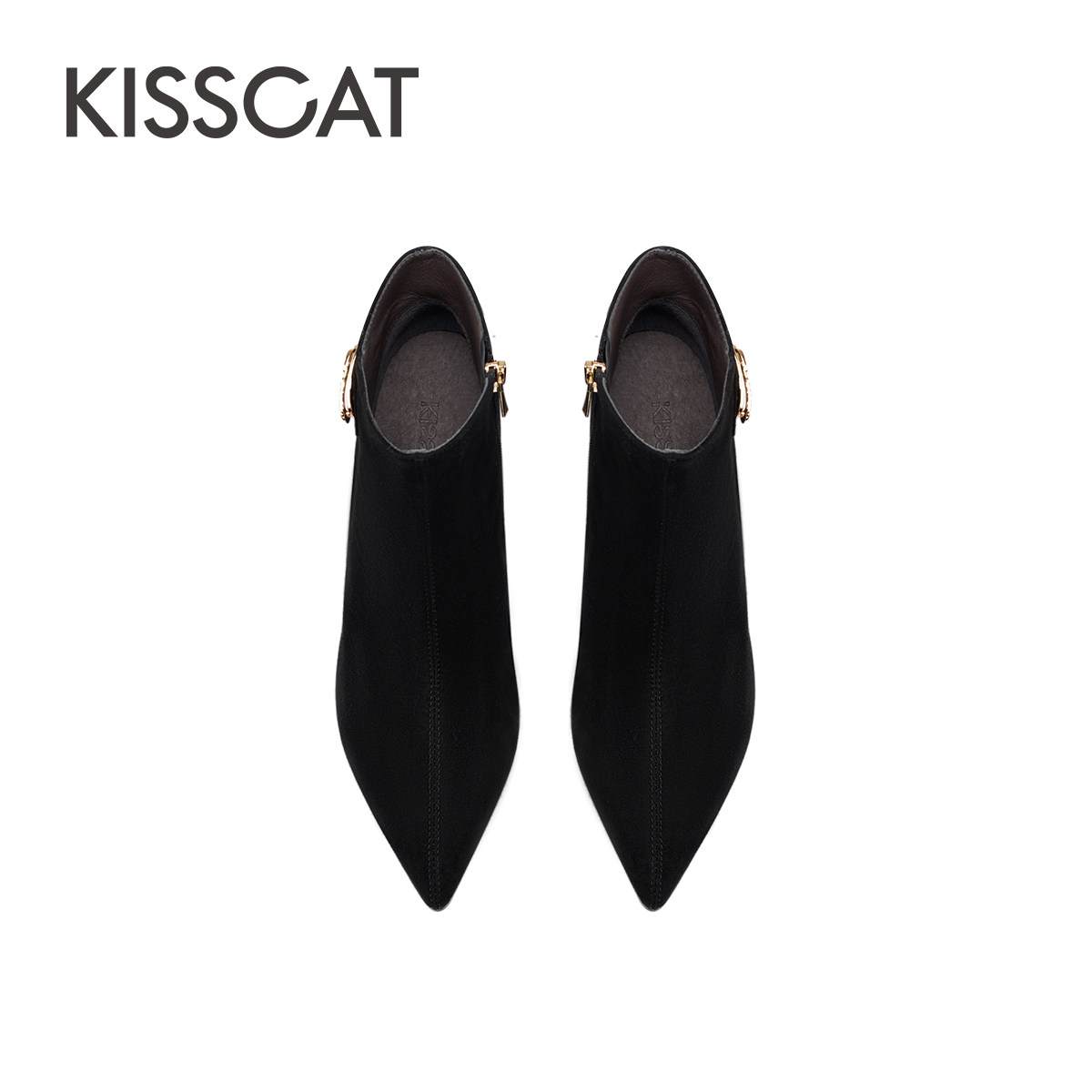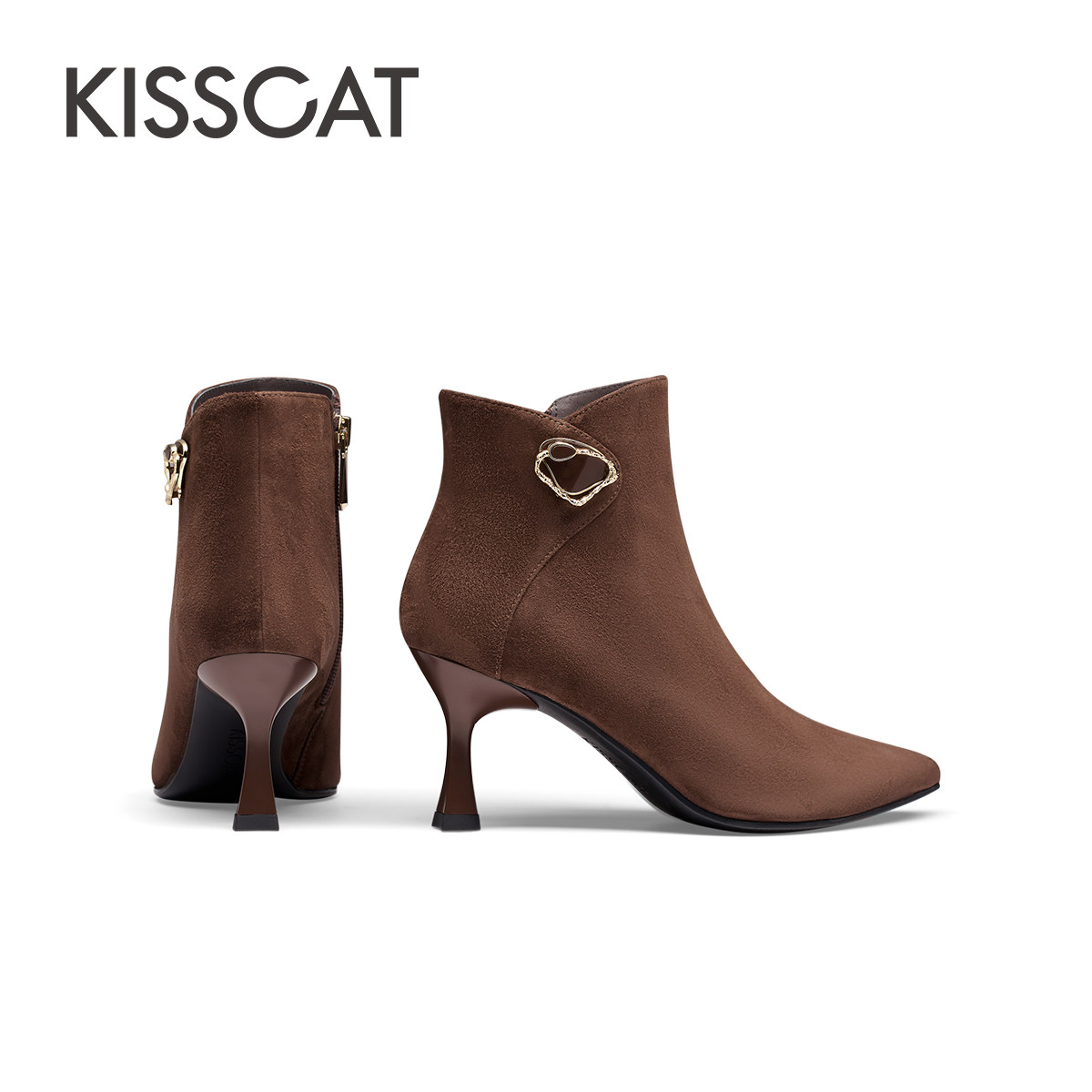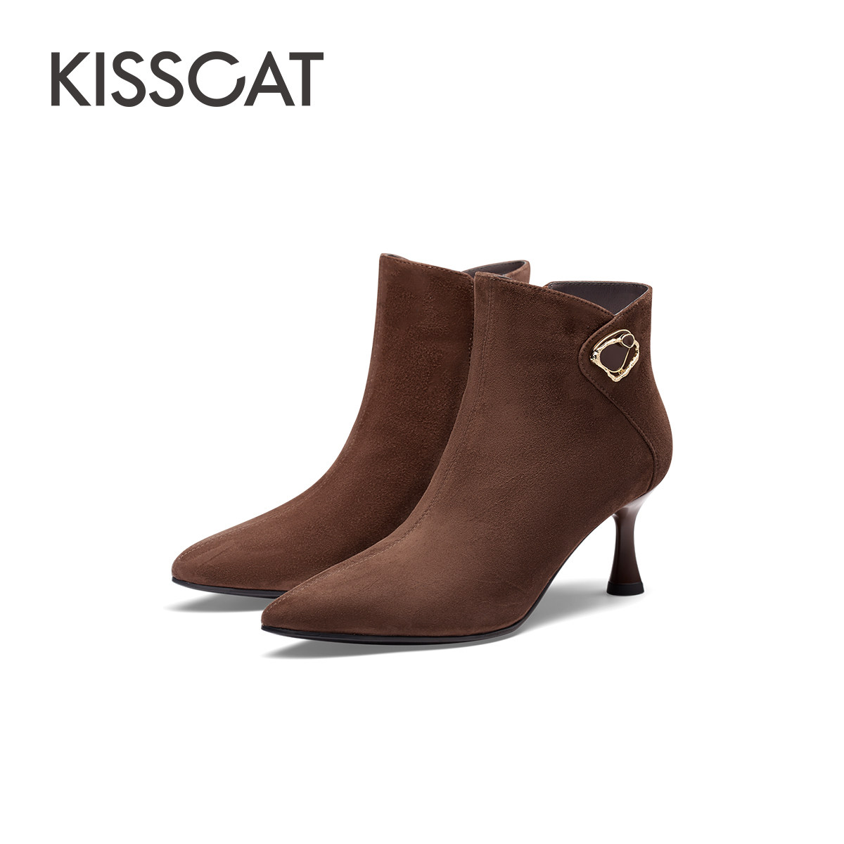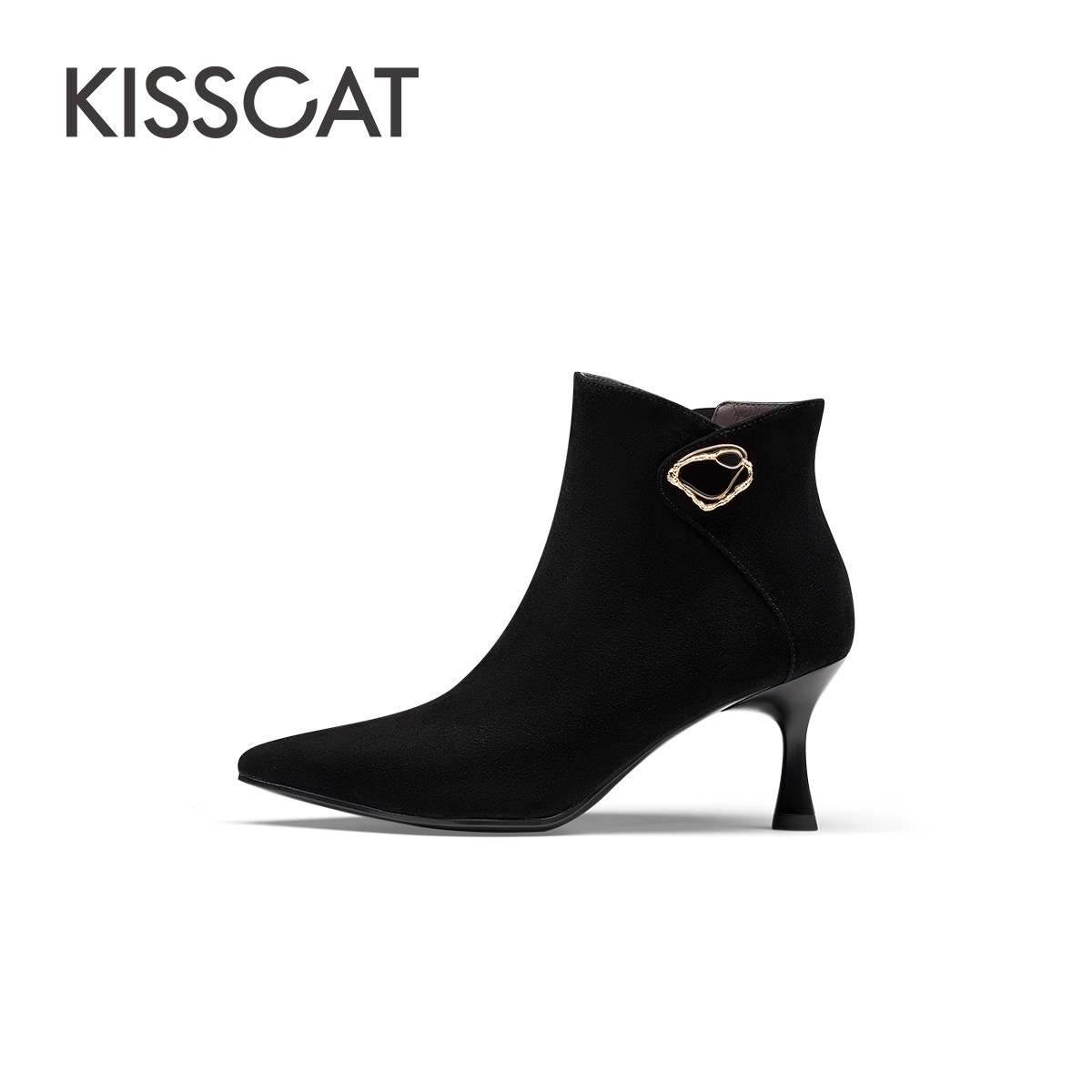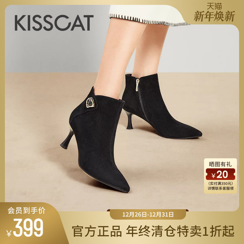 KISSCAT接吻猫新款加绒高跟短靴时尚尖头羊绒时装靴女