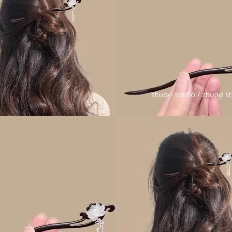 古风莲花檀木发簪女中式步摇流苏盘发簪子日常通勤感汉服头饰双面