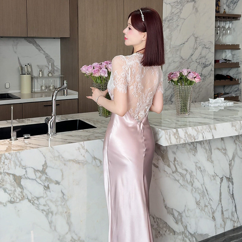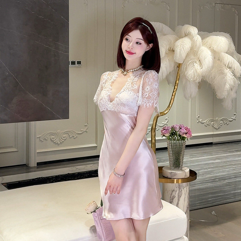 DIMDEVL汀黛25年新款睡衣粉色蕾丝轻奢法式性感带胸垫短袖睡裙