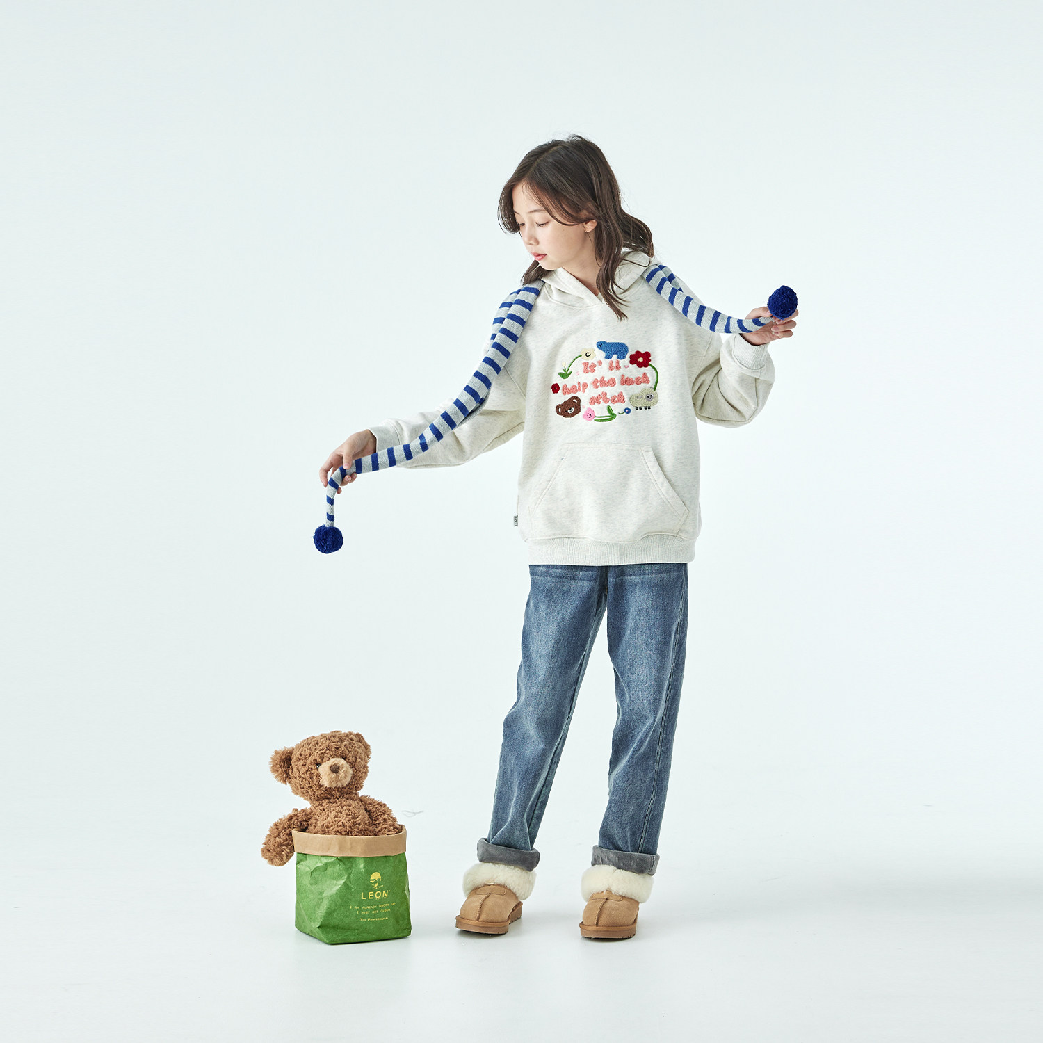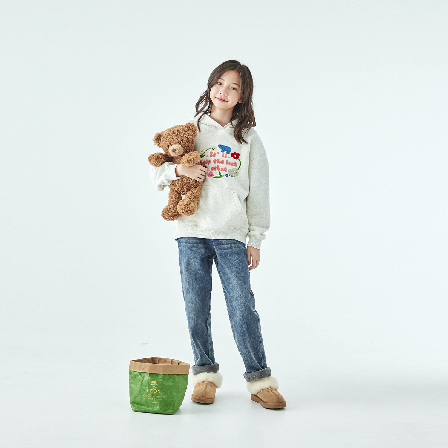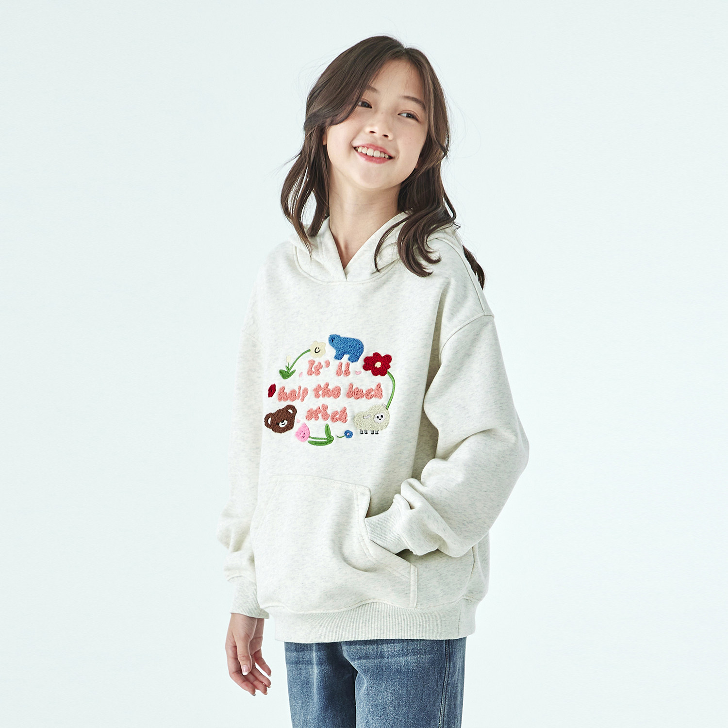 棵初25年冬季新款亲子中大女童连帽图案卫衣恒温抗静电浅花灰上衣
