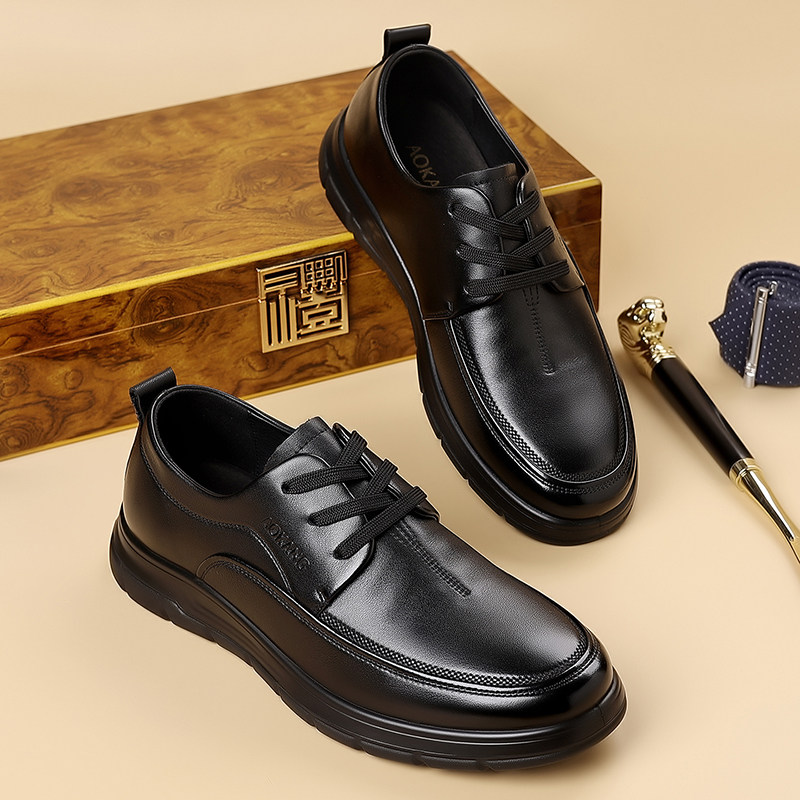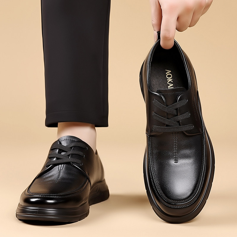 免开胶真皮休闲皮鞋男款软皮厚底增高透气商务系带平底缝线德比鞋