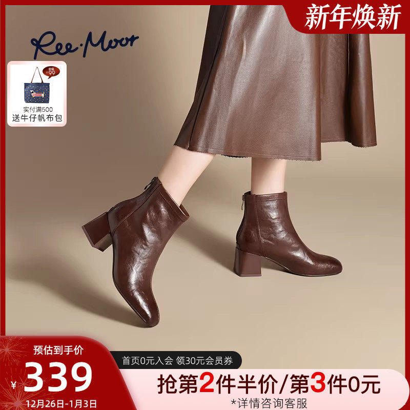 REEMOOR睿慕2025新款法式粗跟瘦瘦靴后拉链时装靴加绒高跟短靴女