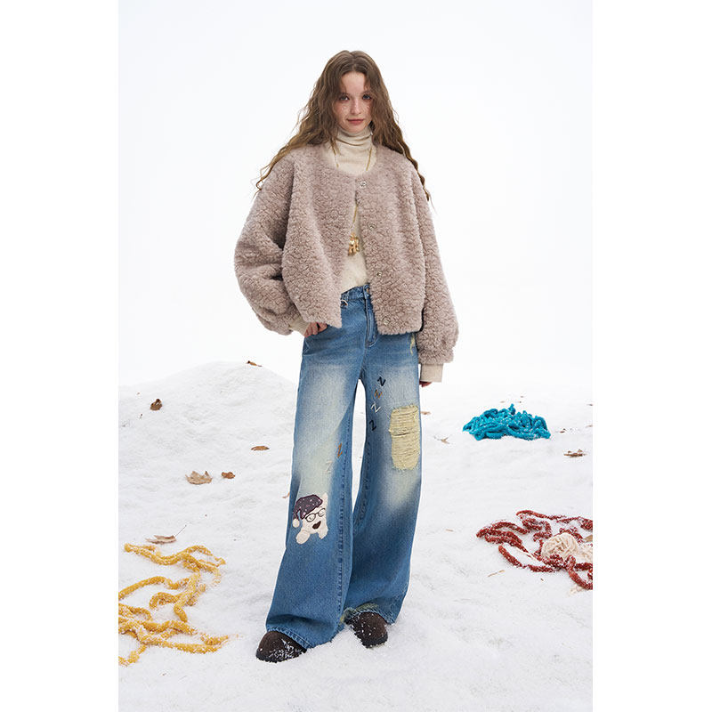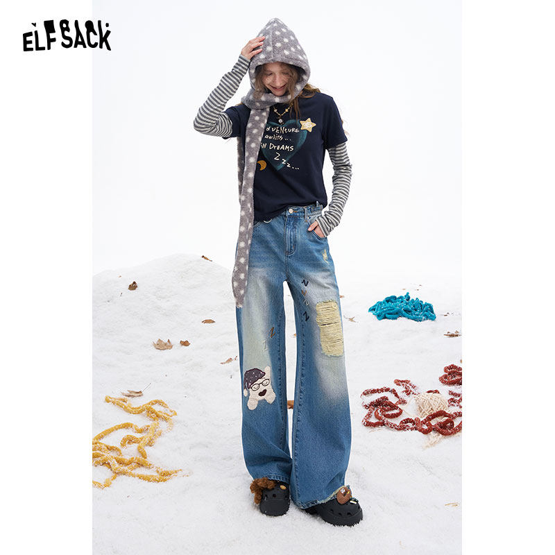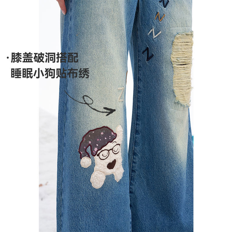【明星同款】妖精的口袋小狗破洞牛仔裤女2025冬季新款显瘦阔腿裤