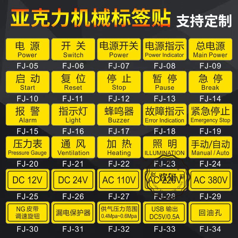 亚克力标签贴设备电源开关急停按钮开关蜂鸣器安全启动停止复位警