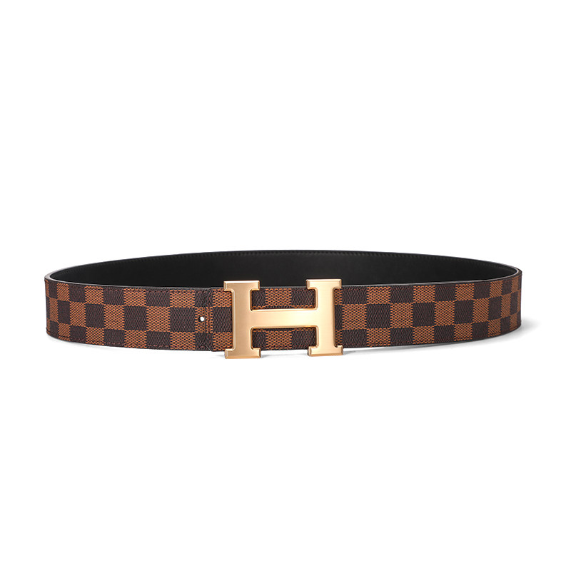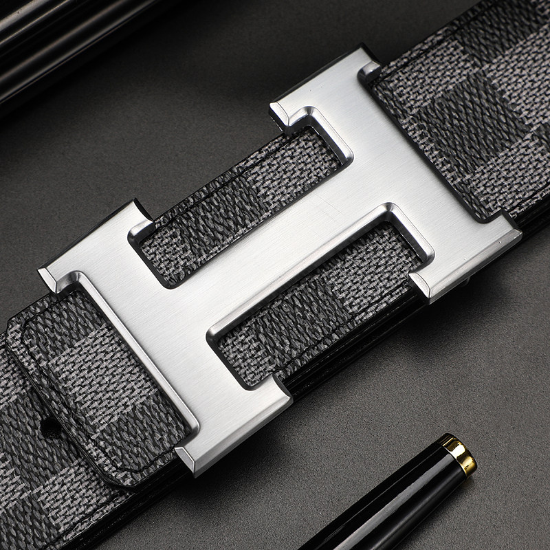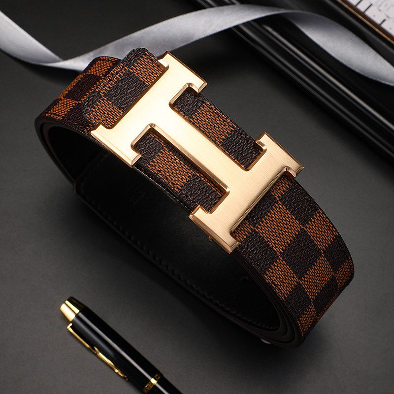 爱马男仕轻奢皮带男士真皮商务青年格纹平滑扣中年腰带工字扣H字