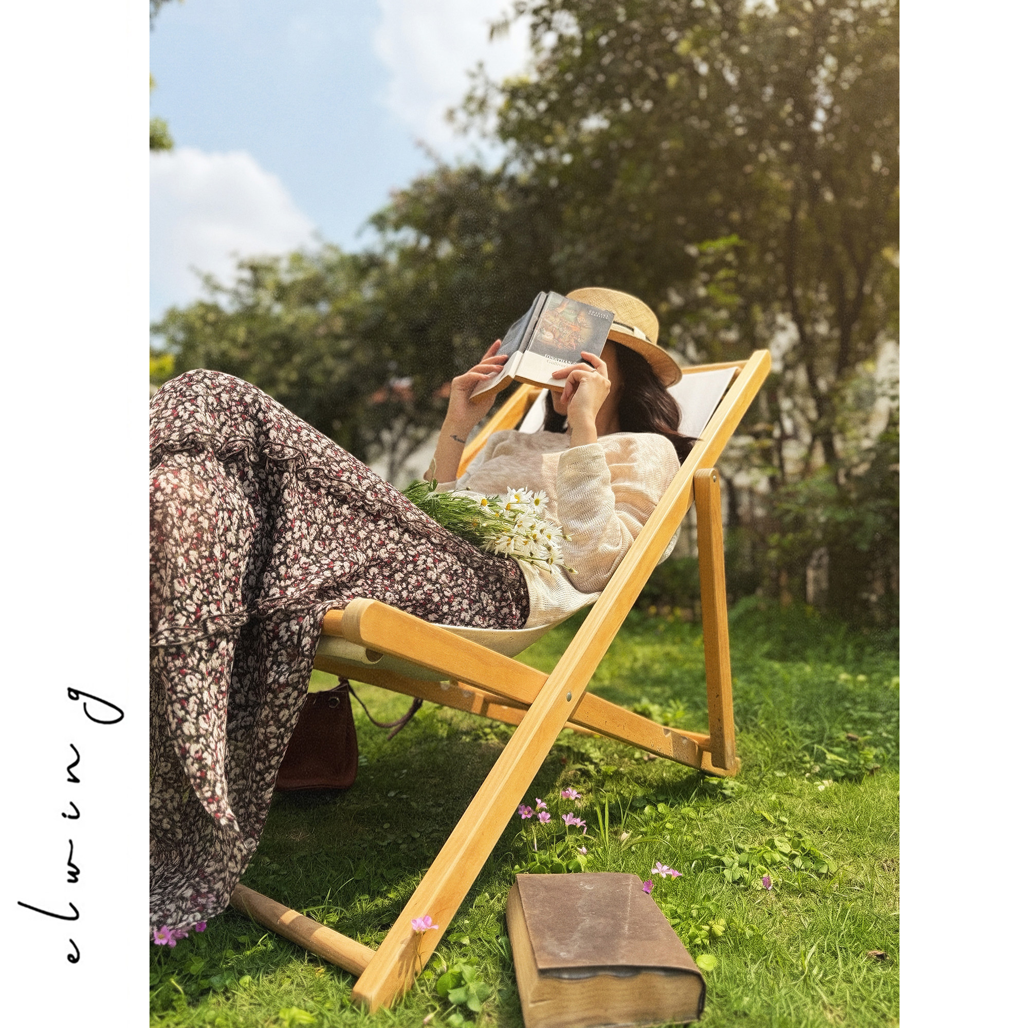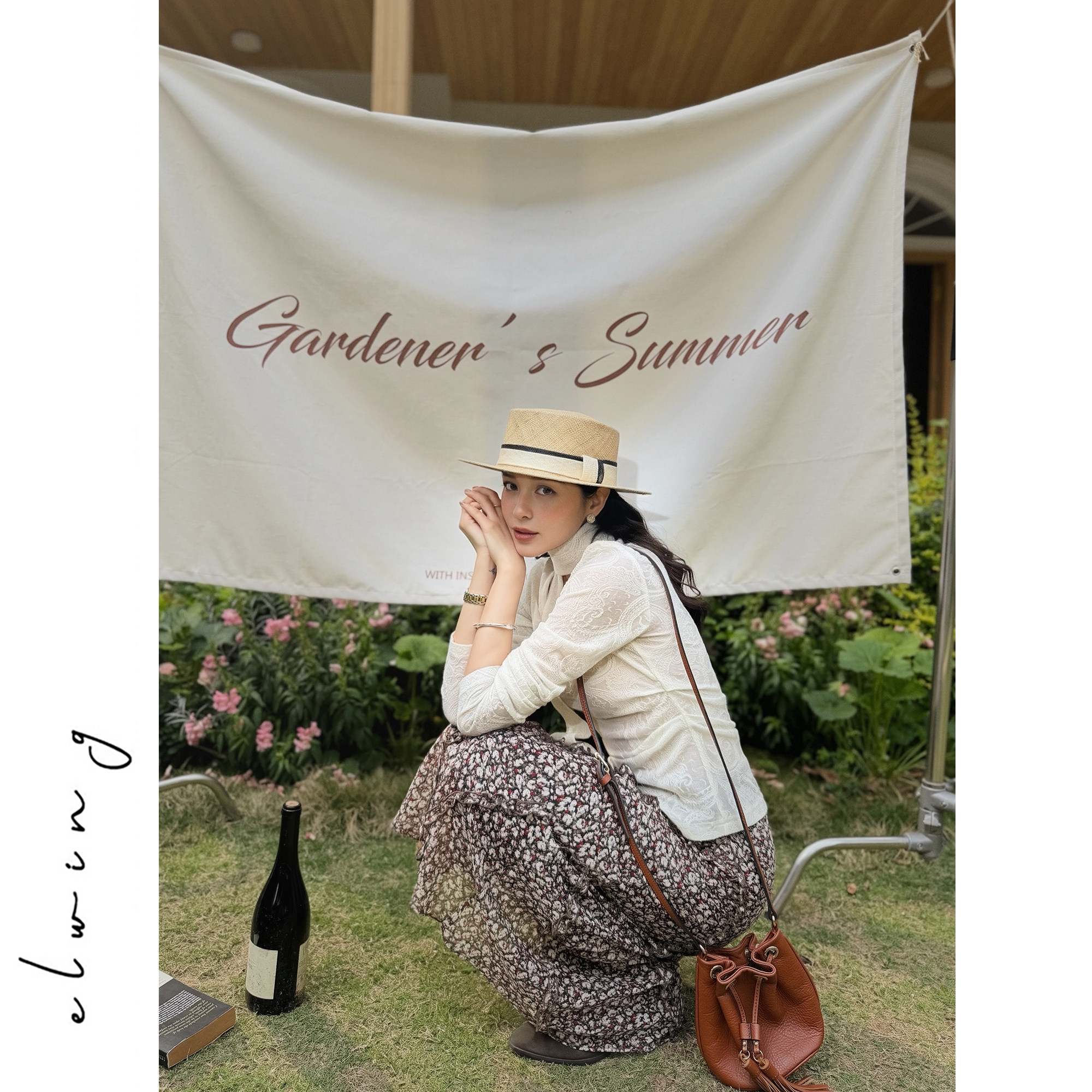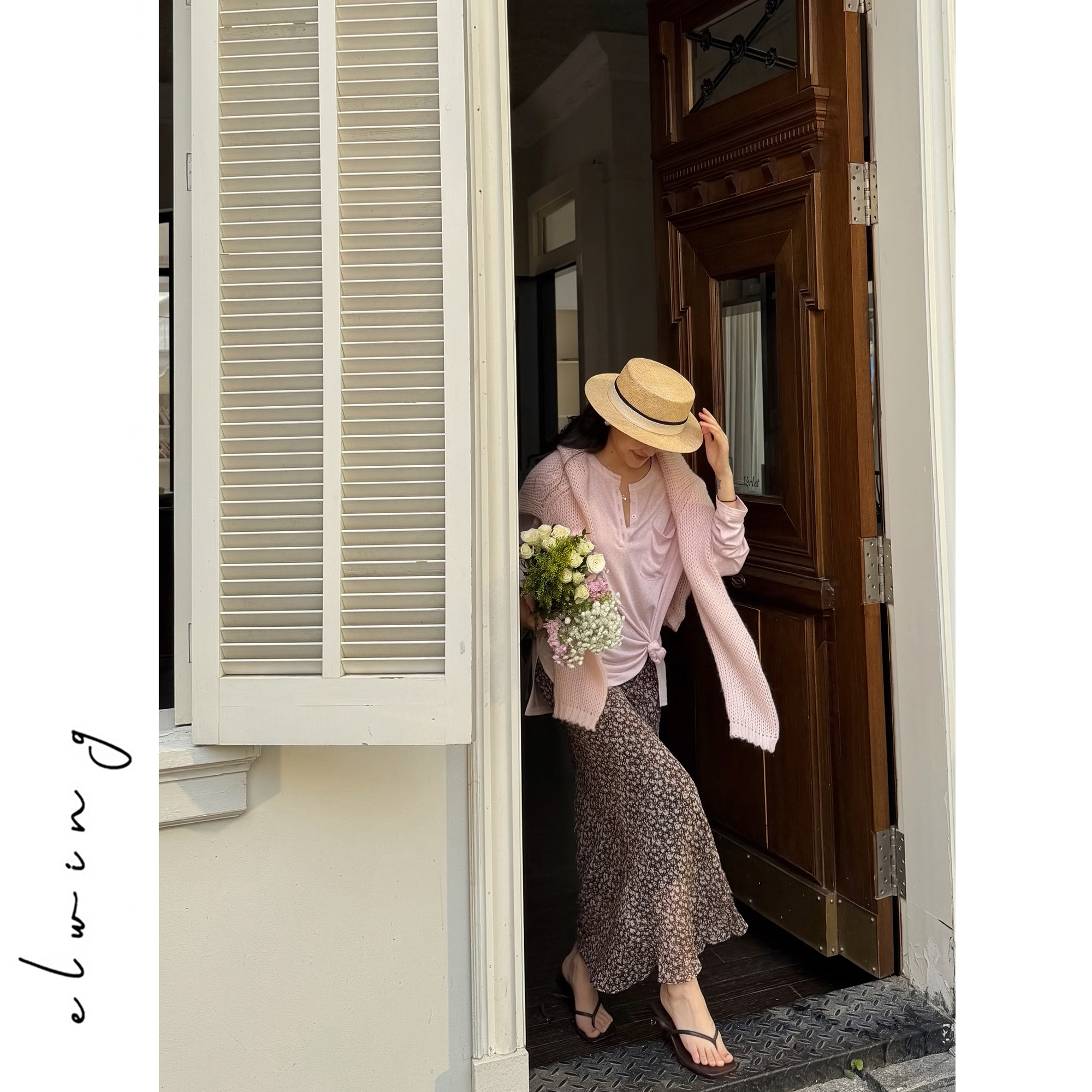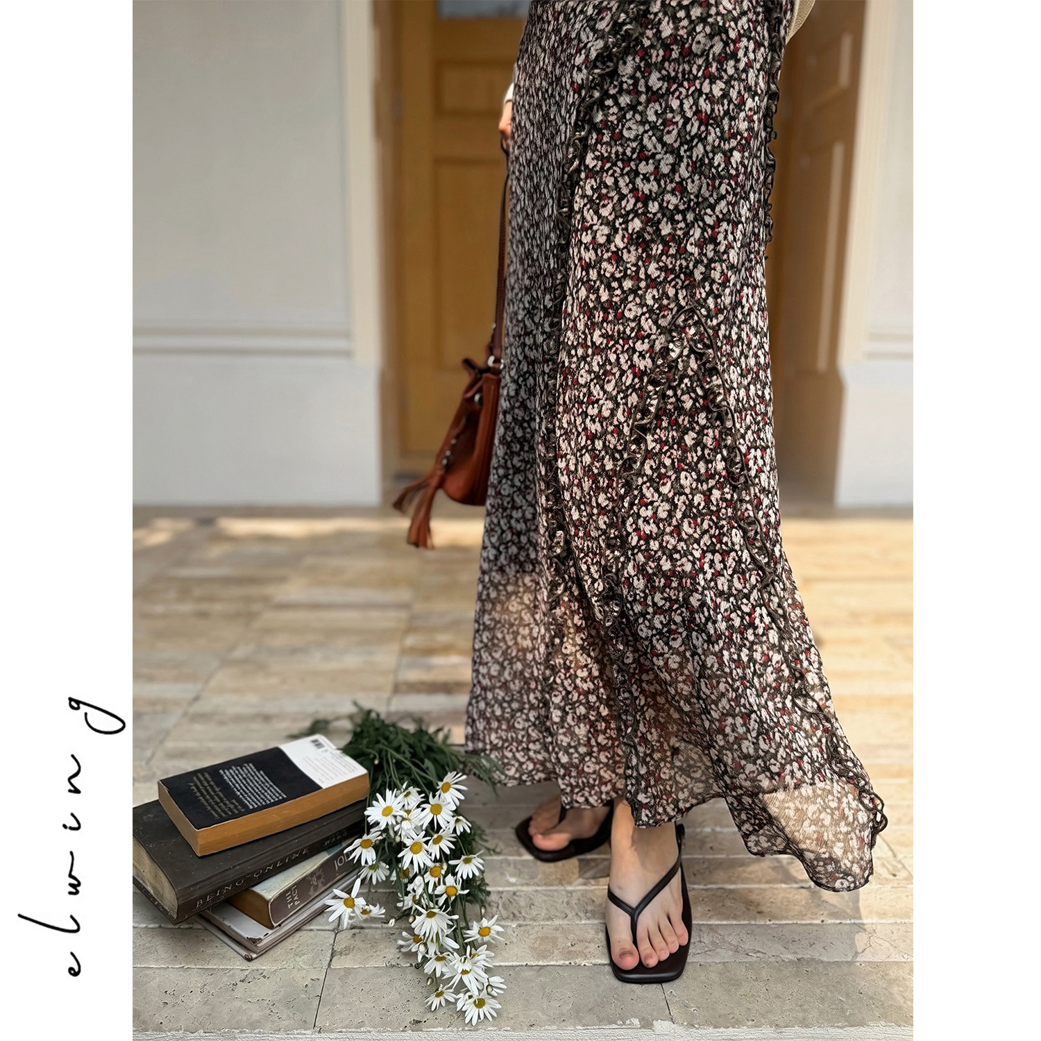 Elwing原创飘逸雪纺粉棕色调碎花斜裁显瘦裙子弹力腰头长款半裙