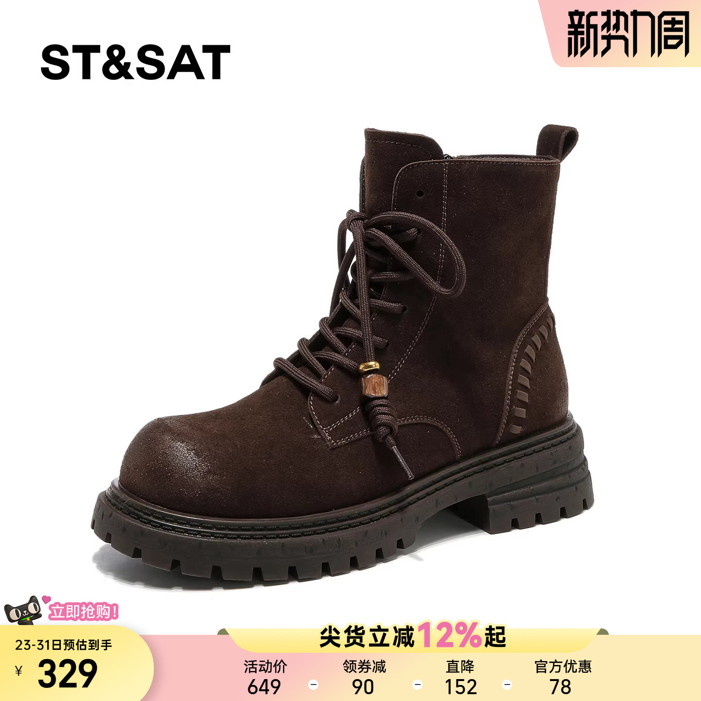 星期六复古擦色马丁靴女加绒2025春新款百搭英伦风不累脚粗跟短靴
