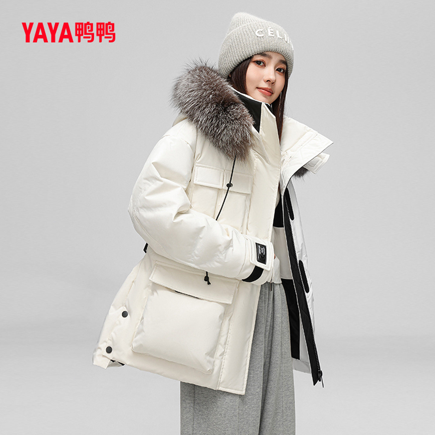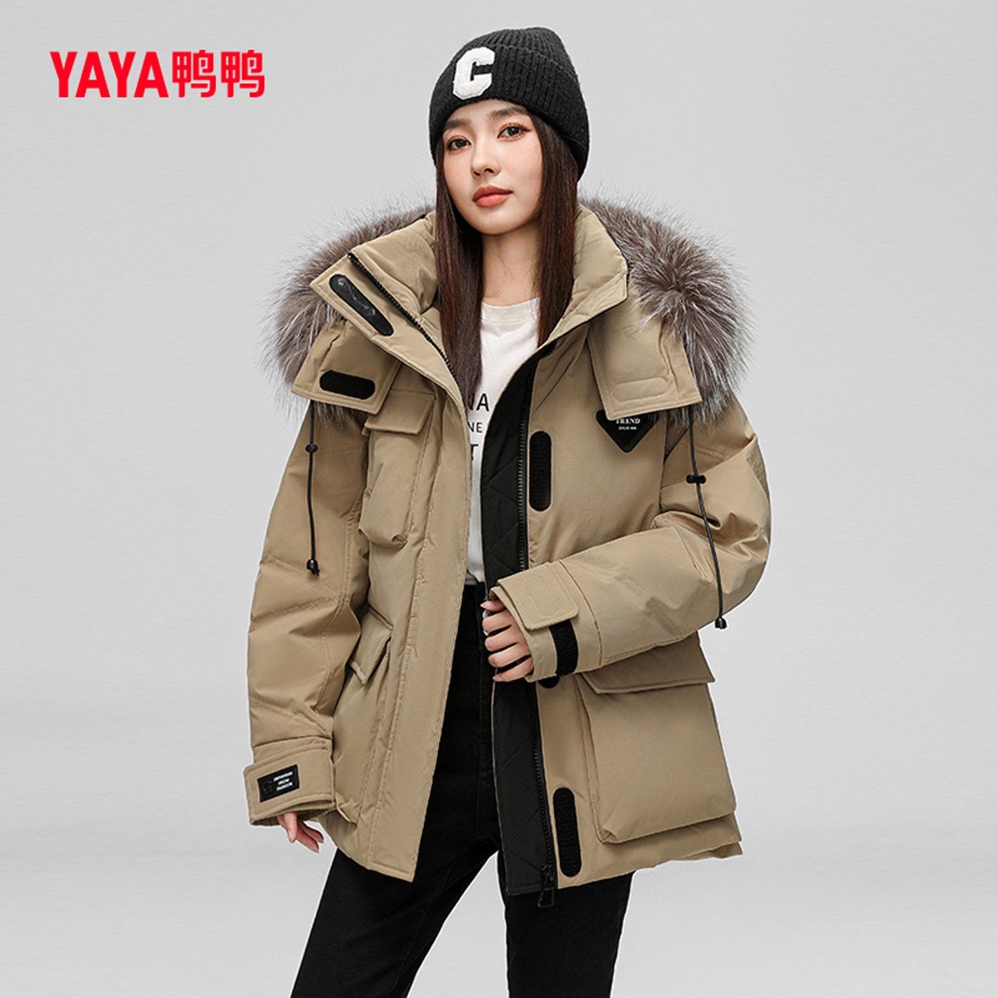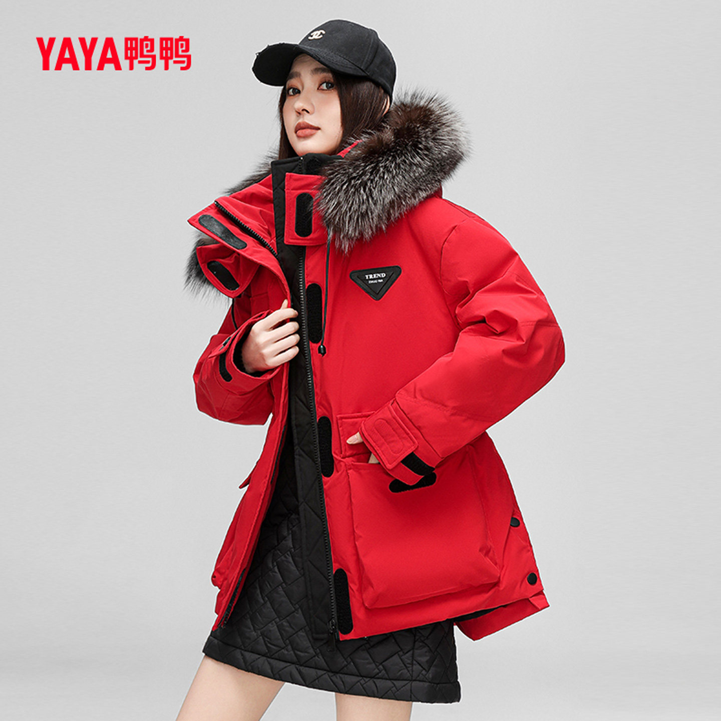 鸭鸭羽绒服女士2024冬季新品中长款连帽狐狸毛领时尚保暖鸭绒外套