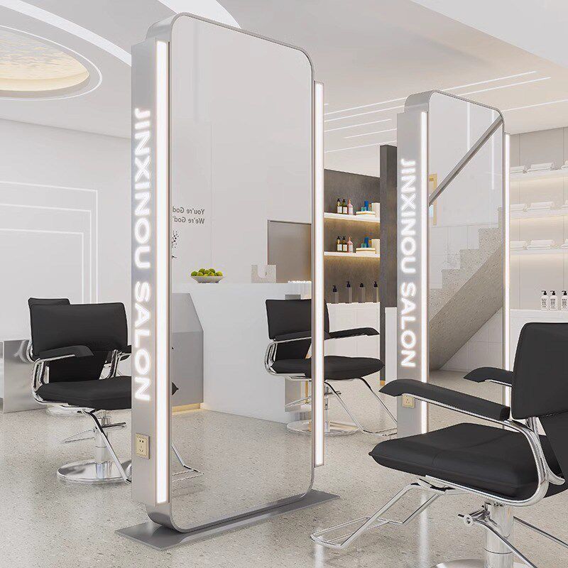 热销网红理发店镜子发廊专用剪发镜子不锈钢带灯落地全身镜美发店