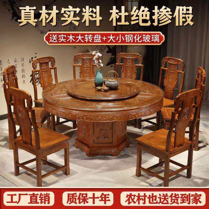 【首单立减】全实木中式餐桌椅组合新款雕花带转盘橡木圆形餐桌