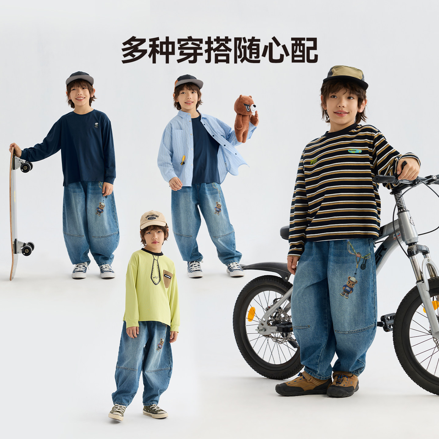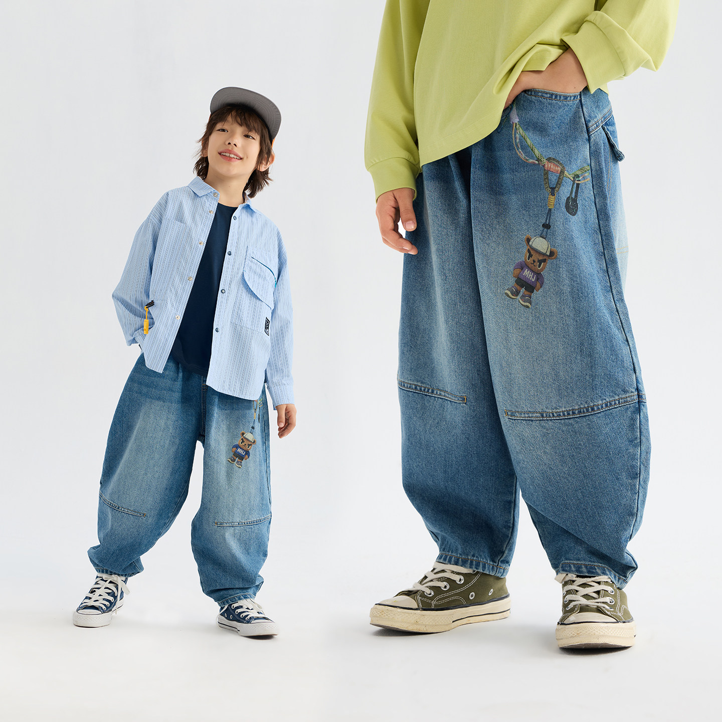 MANHOJIA【小熊定番裤】儿童软牛仔春新品水洗做旧松弛印花牛仔裤
