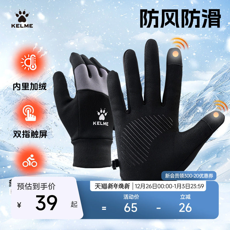 KELME卡尔美防风成人加绒保暖运动手套儿童足球跑步触屏骑行手套