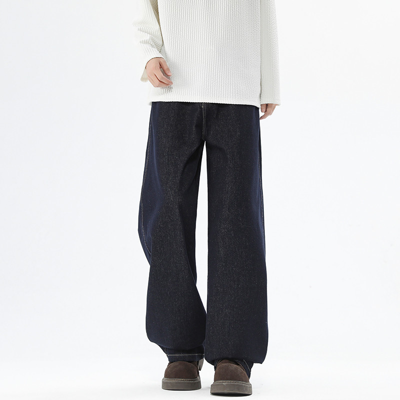 NEVERNEED原色加绒直筒牛仔裤男女冬季美式潮牌cleanfit宽松A字裤